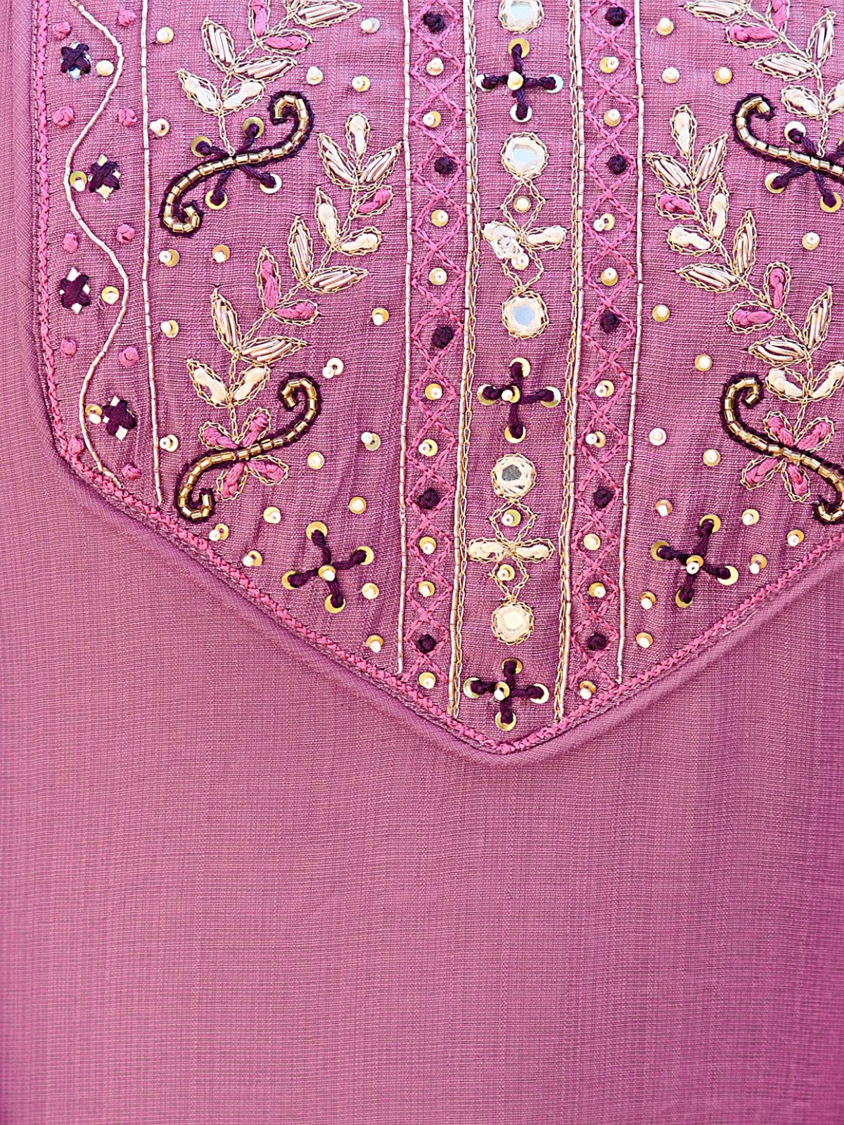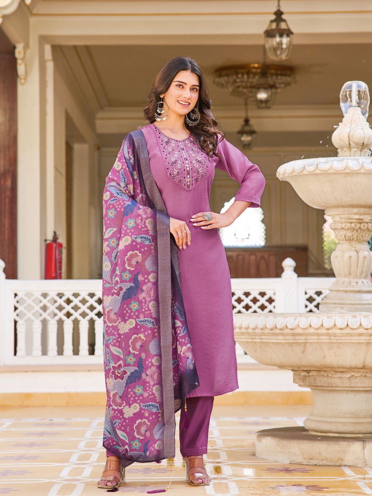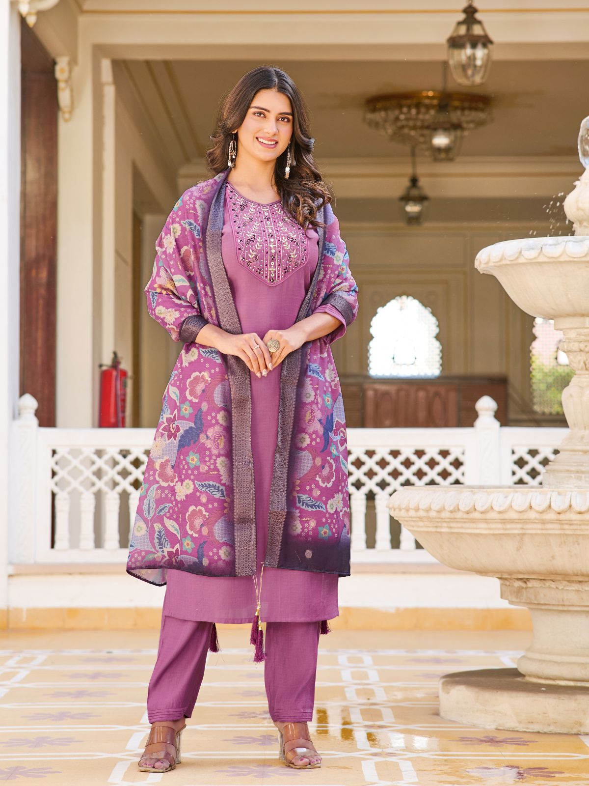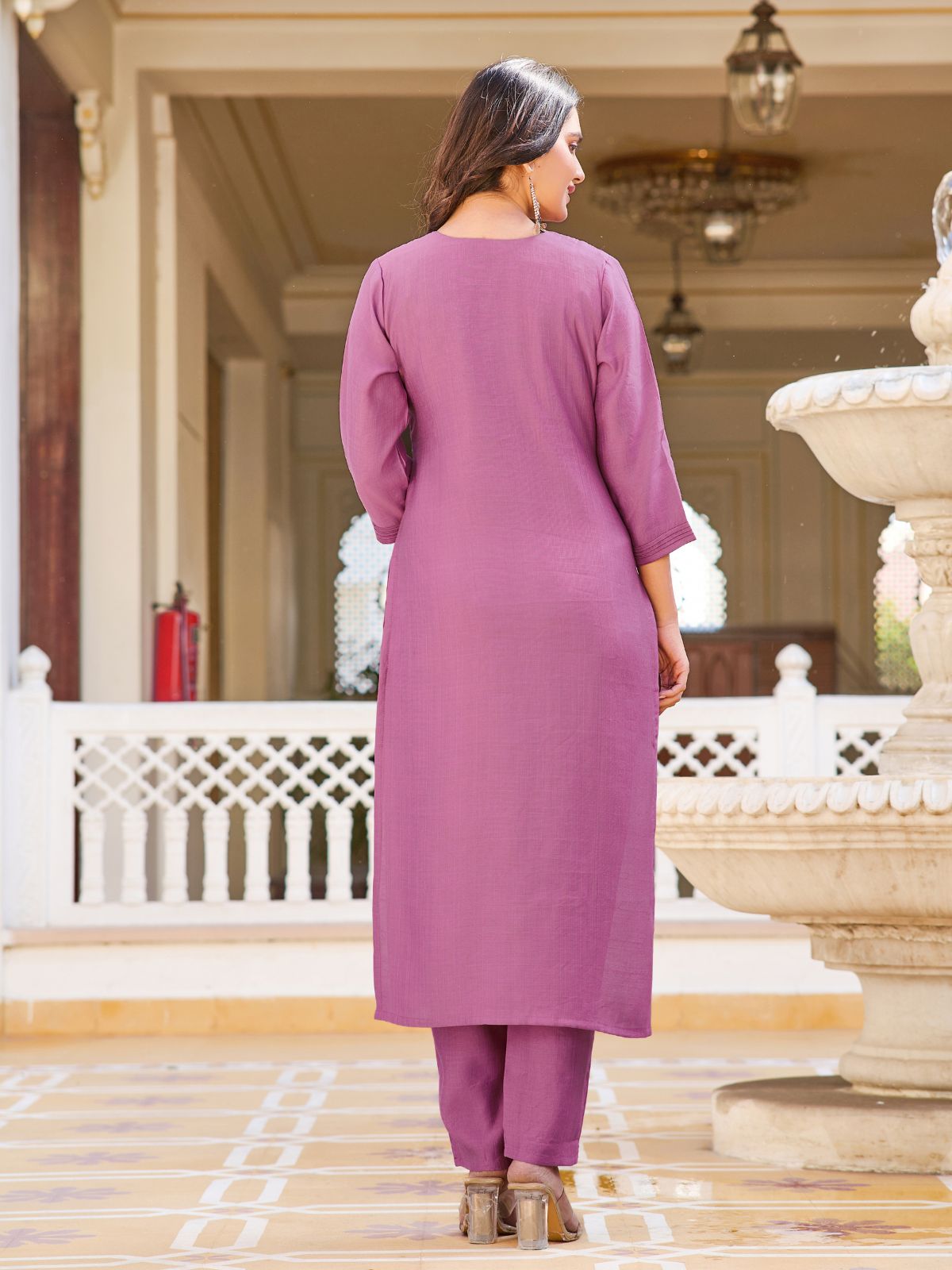 Odette Purple Rayon Embroidered Stitched Kurta Set For Women