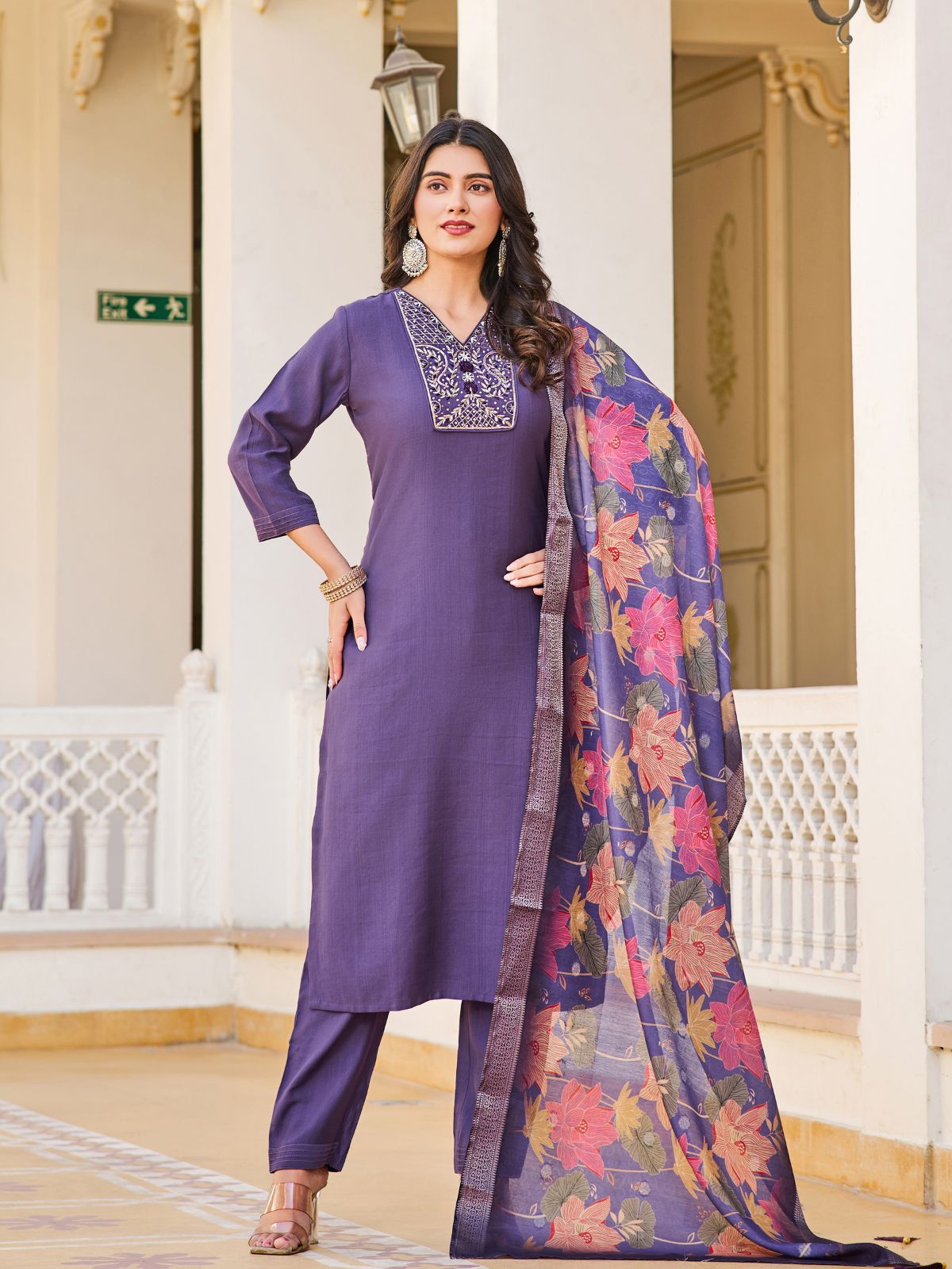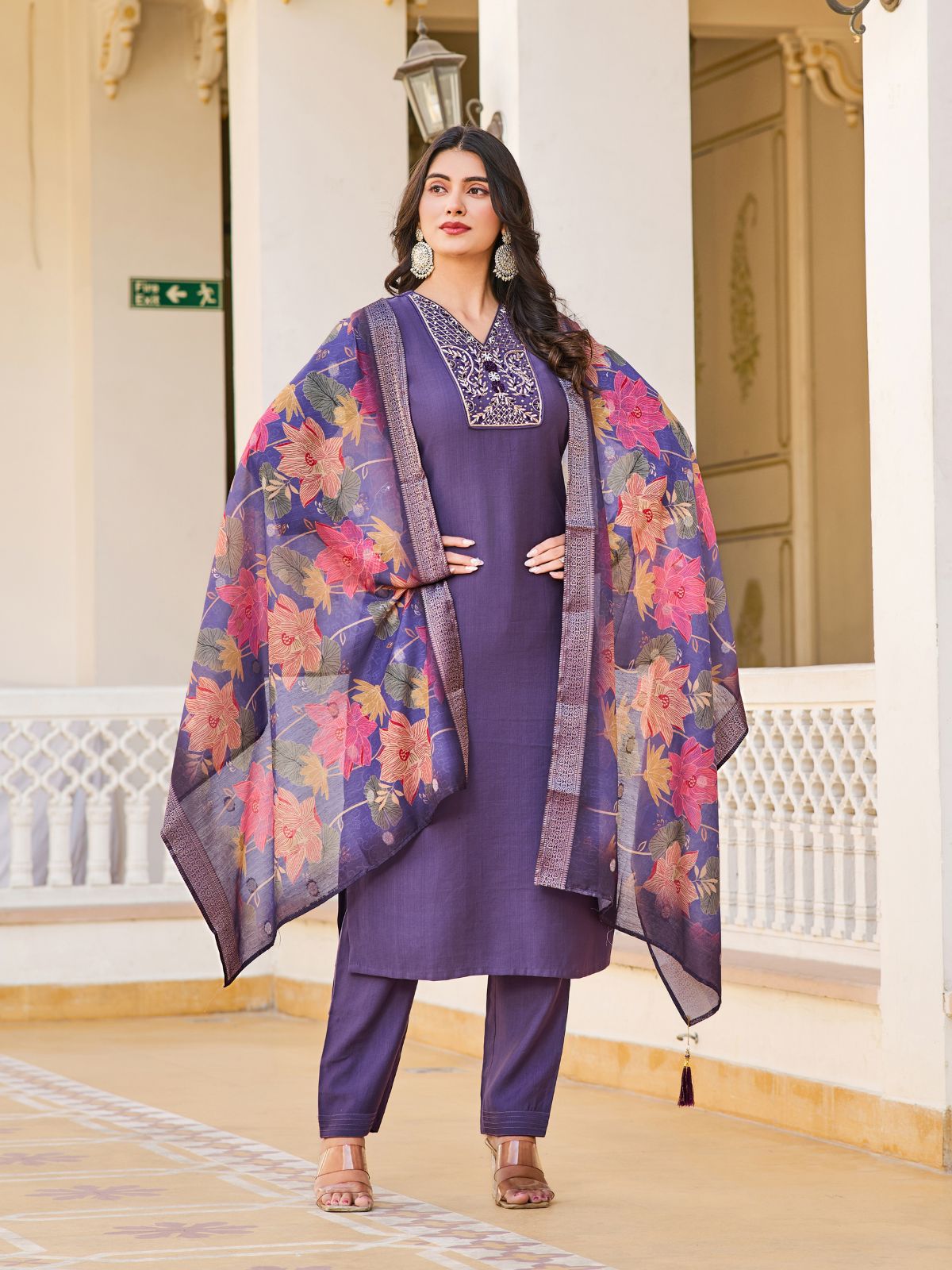 This embroidered kurta set is a great choice for parties and festivities. The kurta set comes with matching lower and dupatta. This one looks great with a pair of danglers and heels.