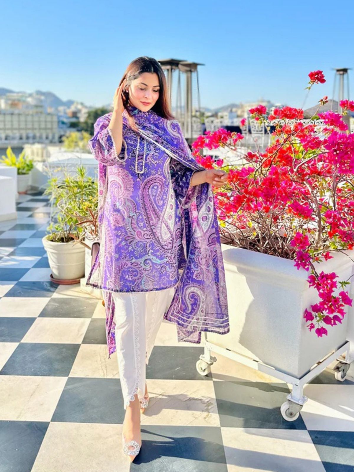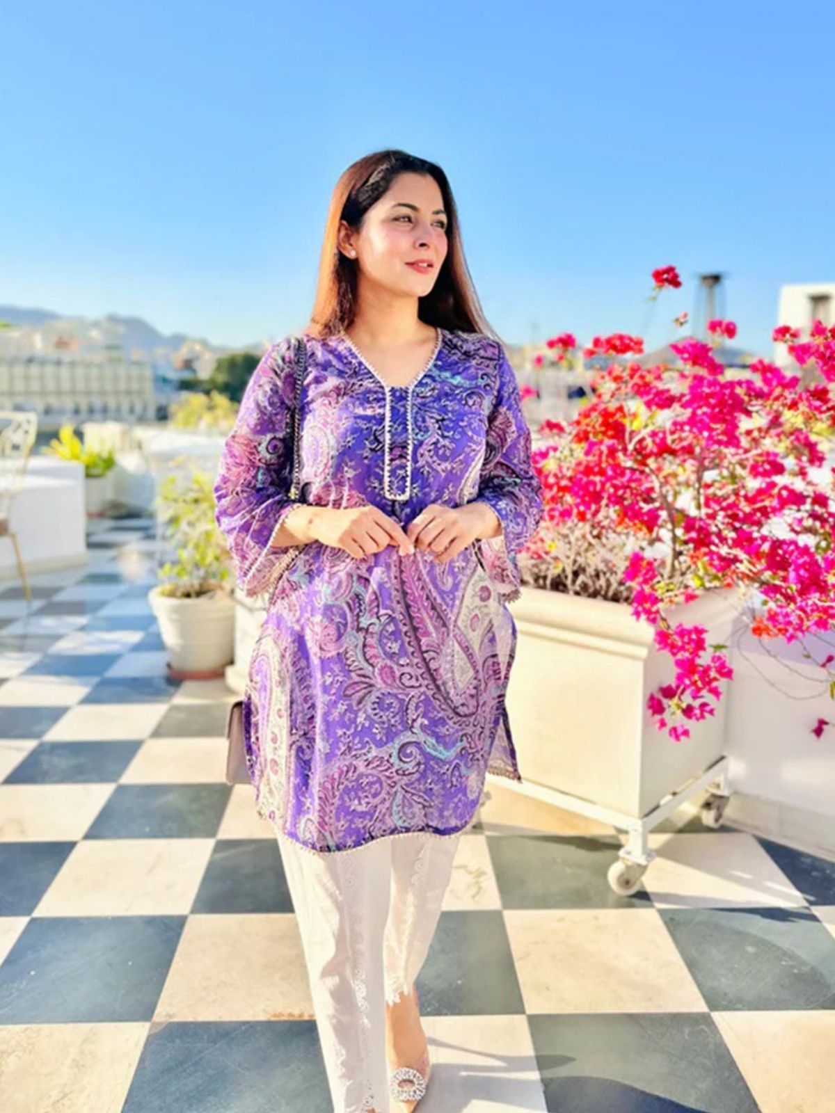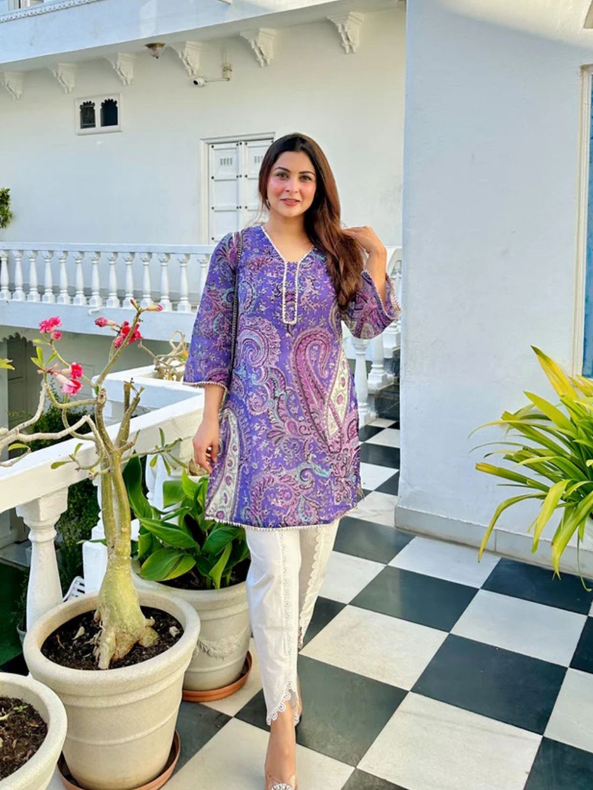 Odette Purple Viscose Printed Stiched Kurta Set For Women