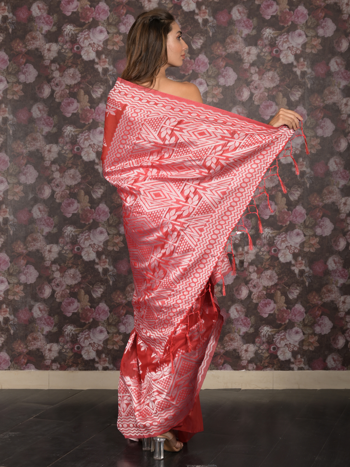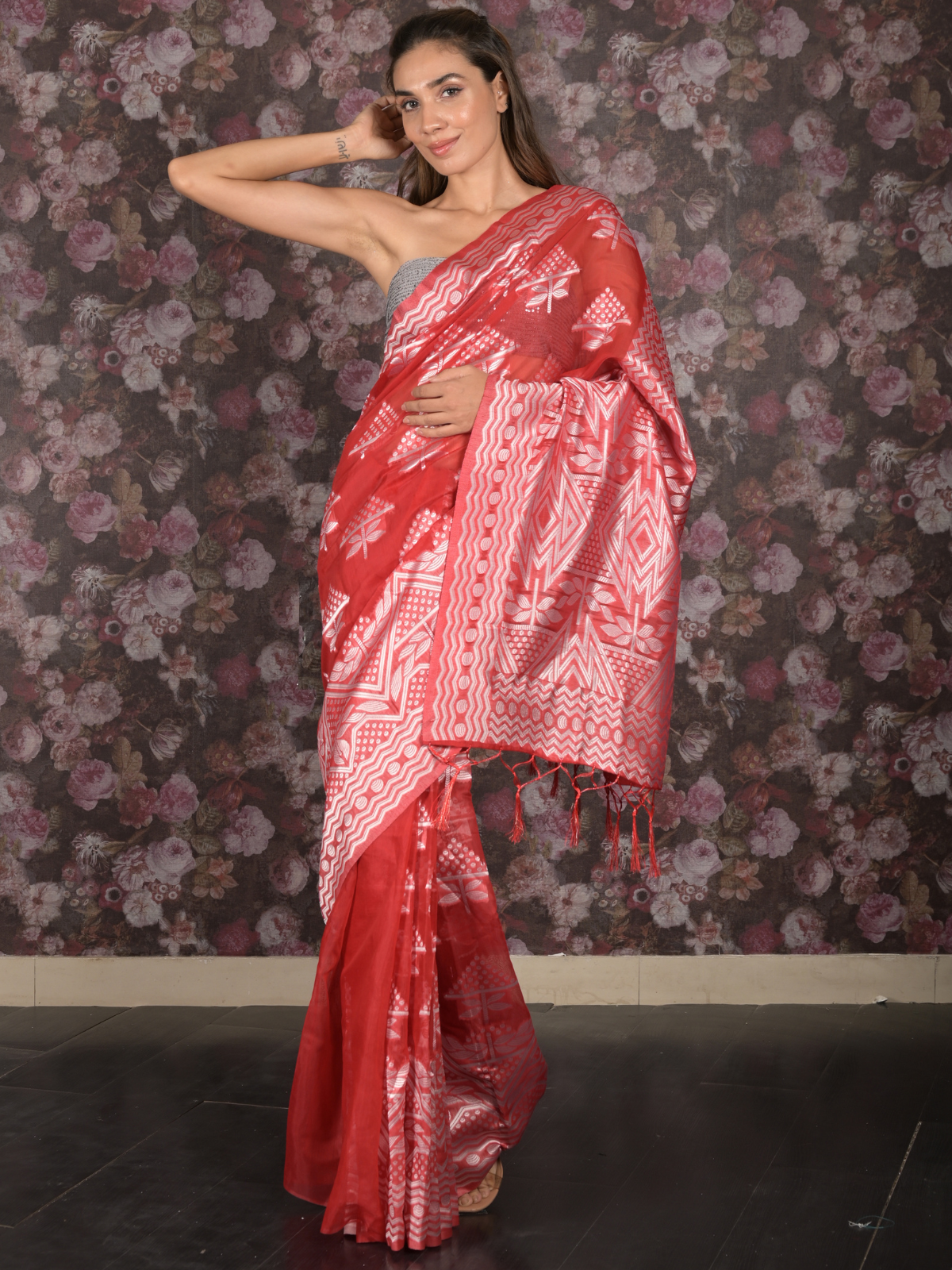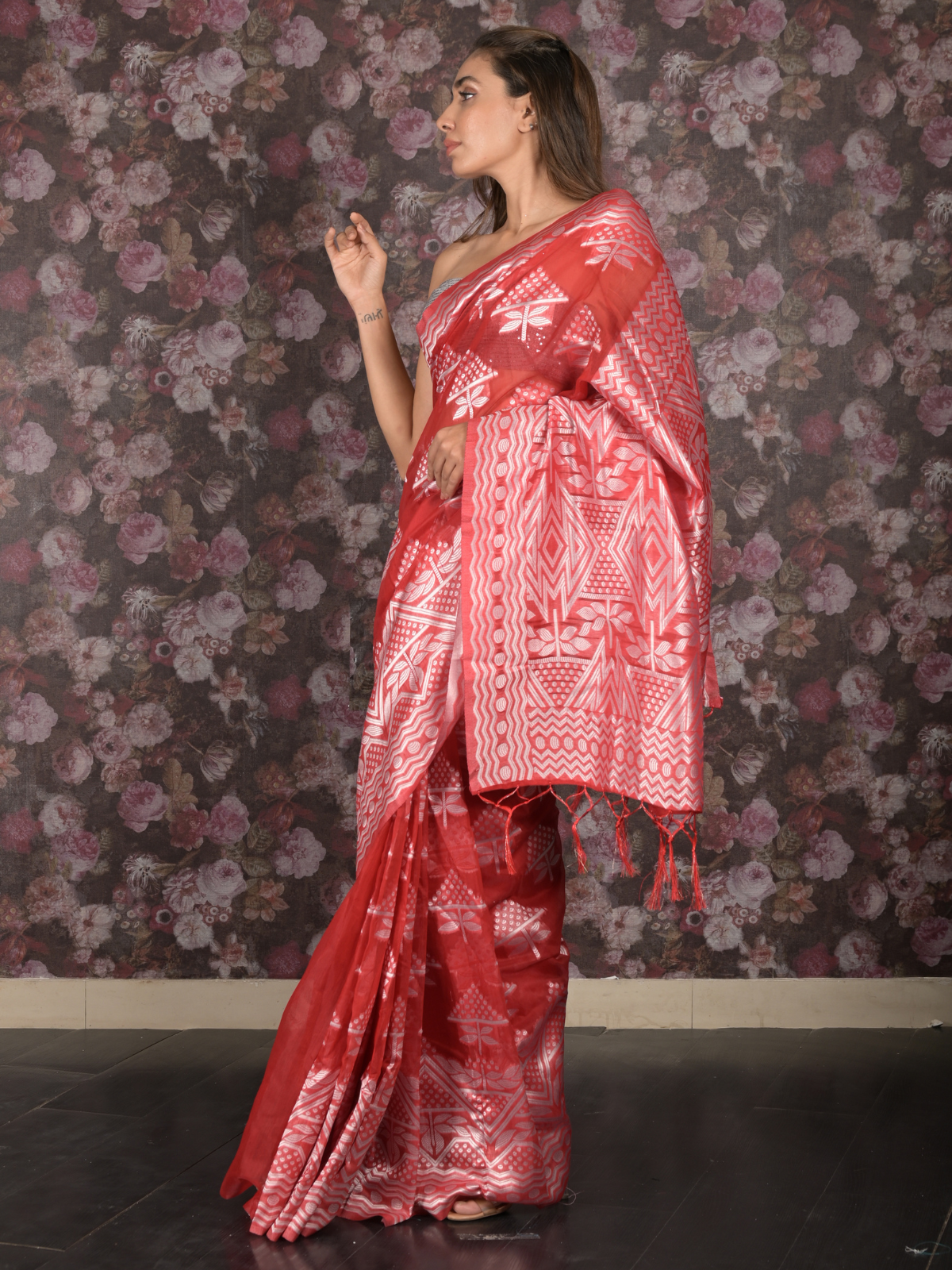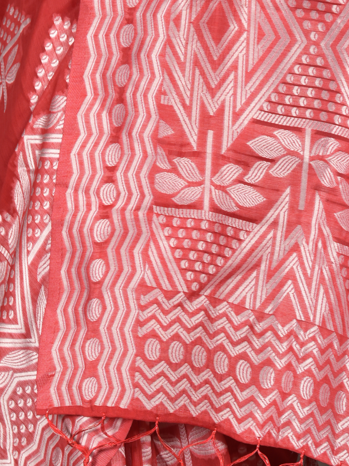 Odette Red Cotton Blend Woven Saree with Unstitched Blouse for Women