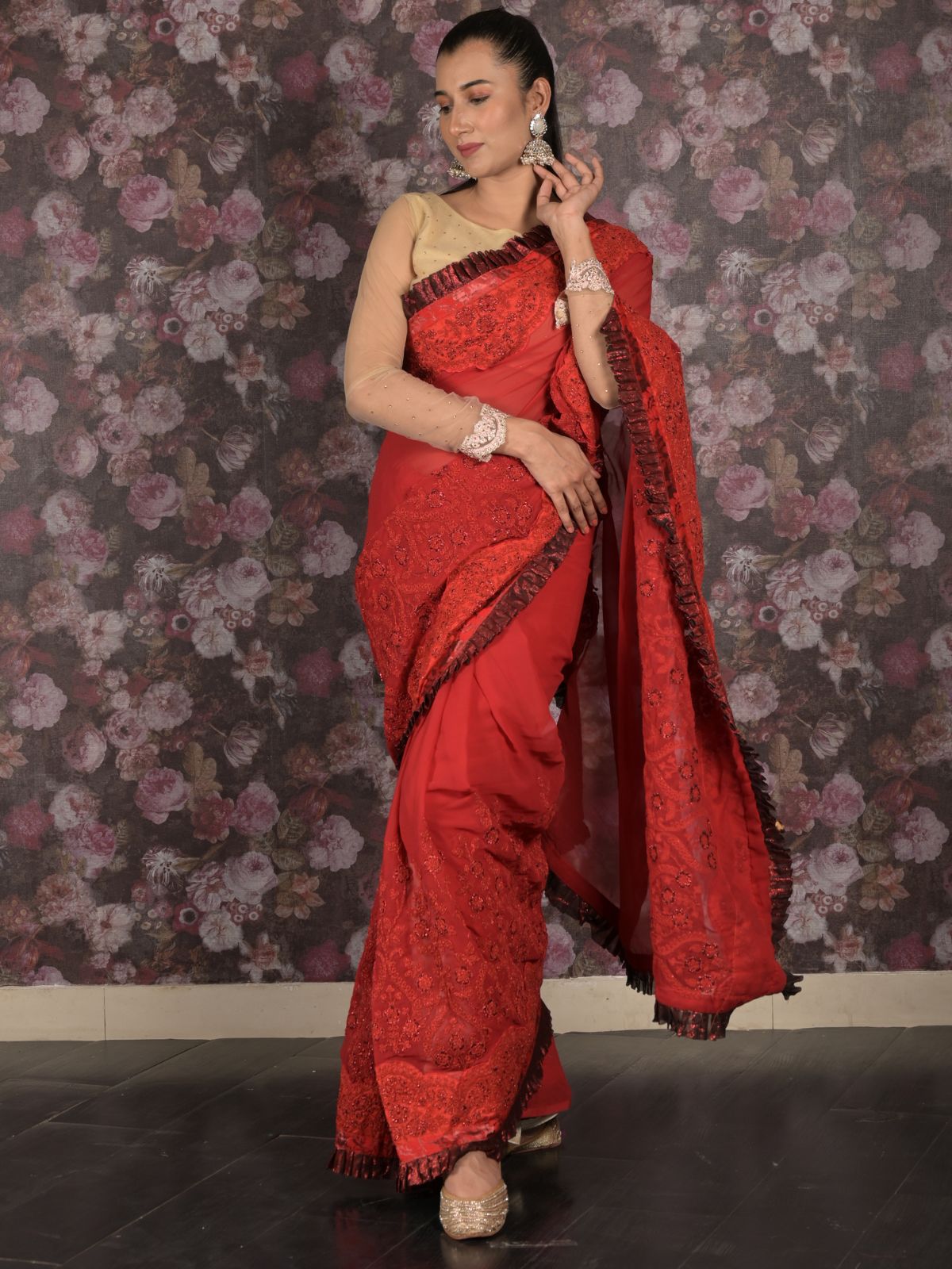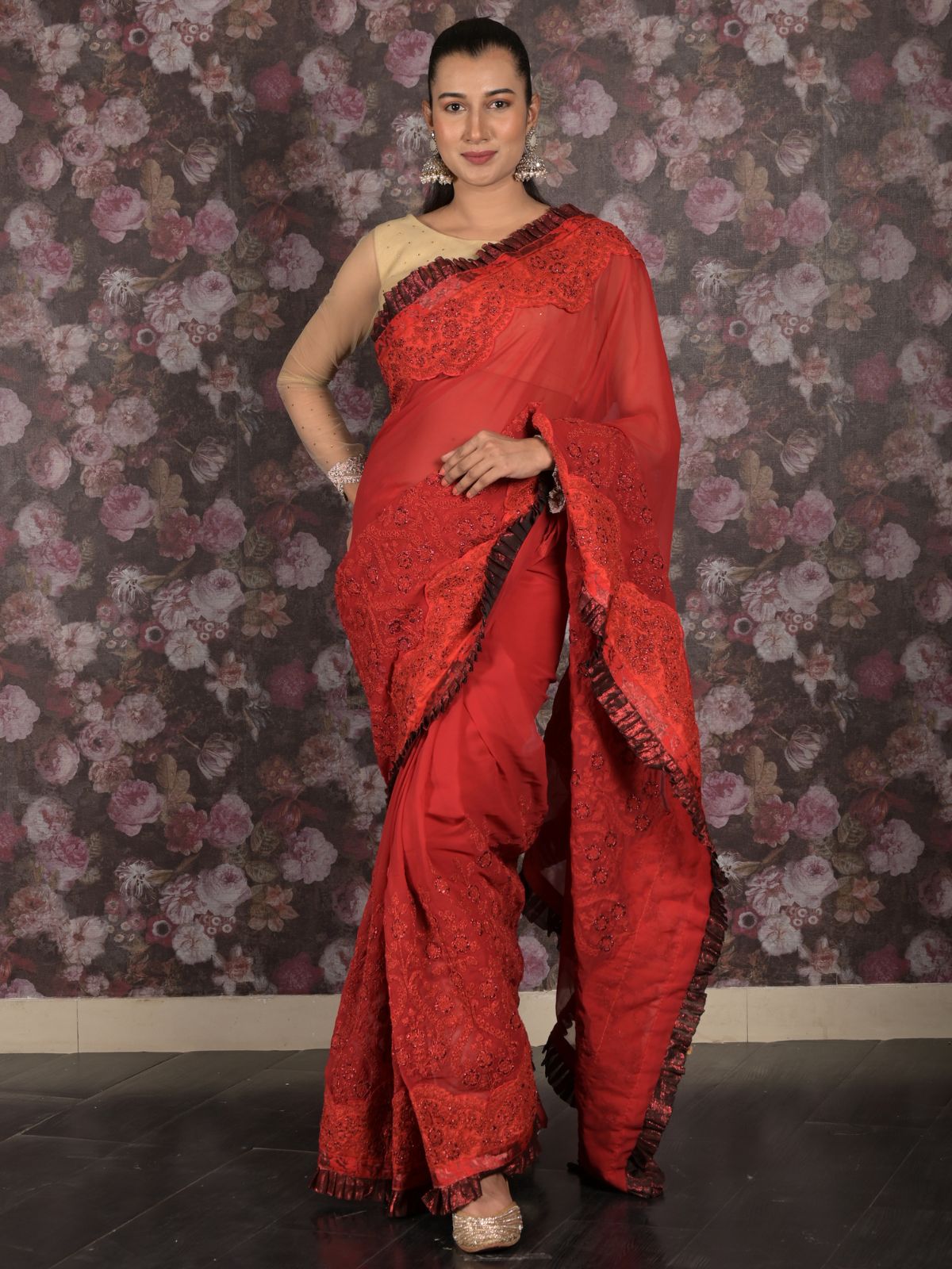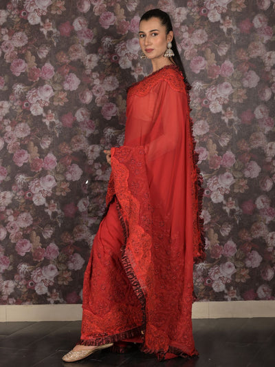 Odette Red Ruffled Georgette Saree With Unstitched Blouse For Women