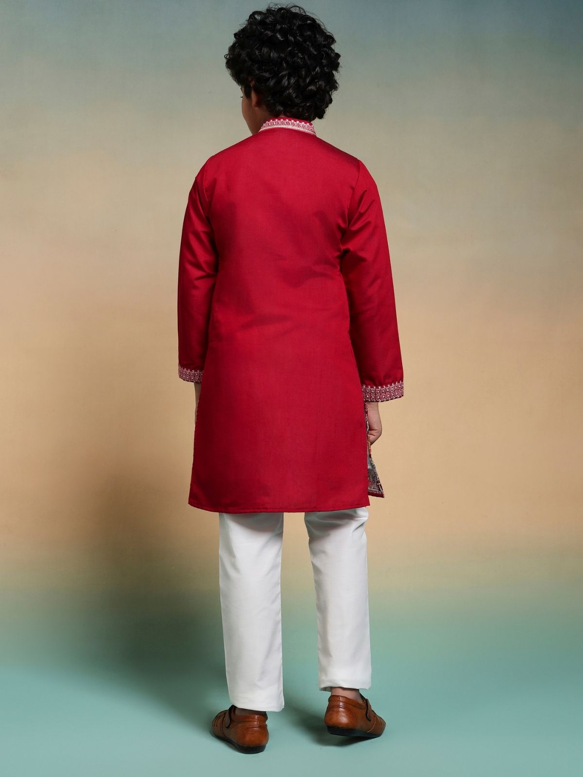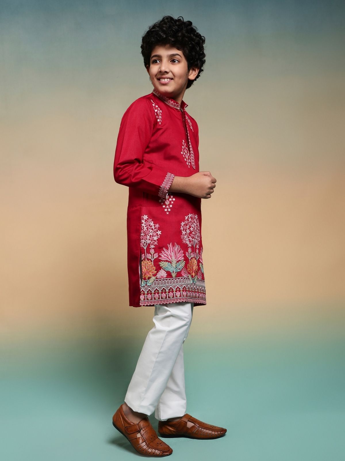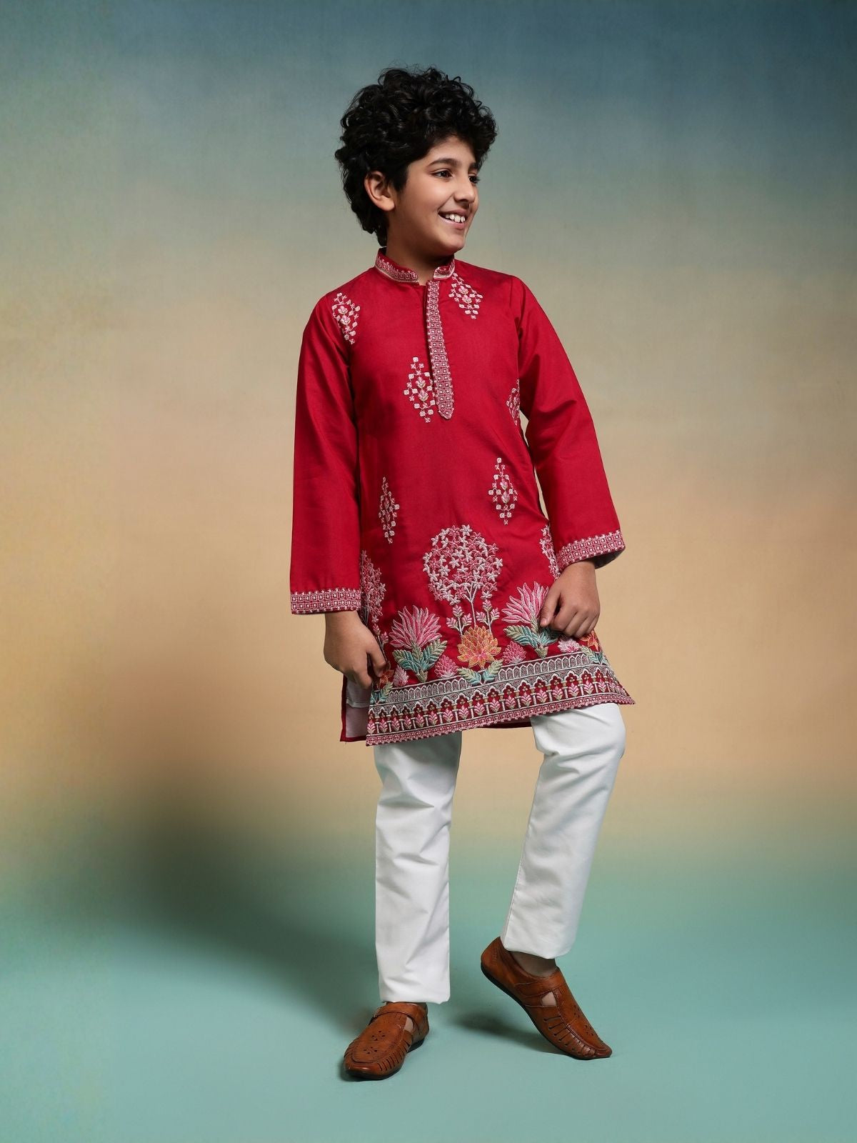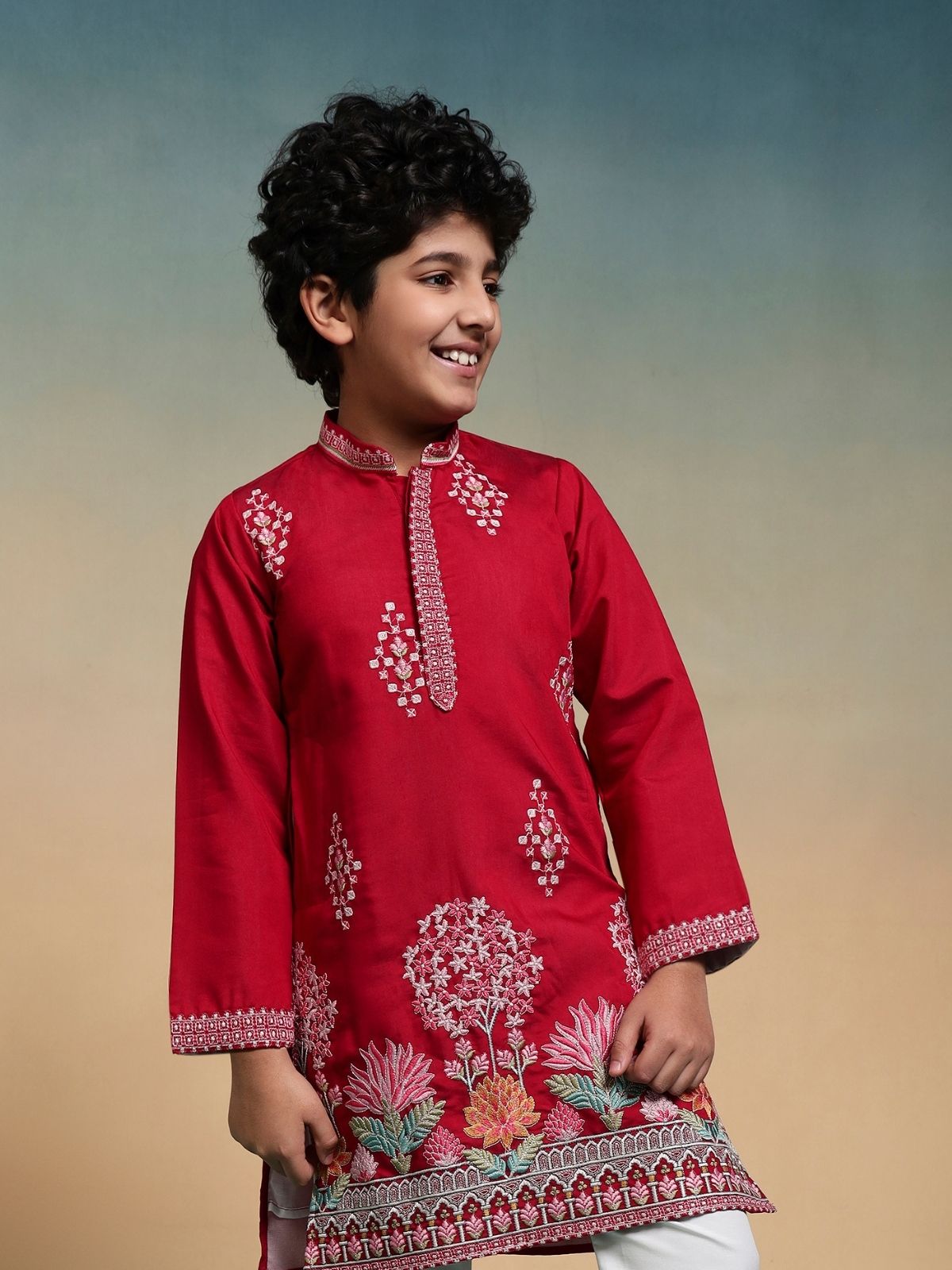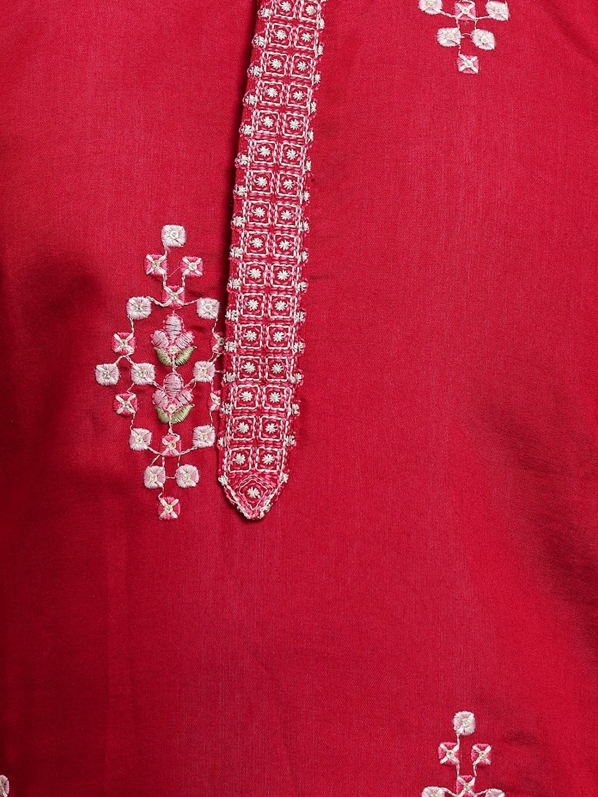 Odette Red Viscose Silk Embroidered Stitched Kurta Set For Kids
