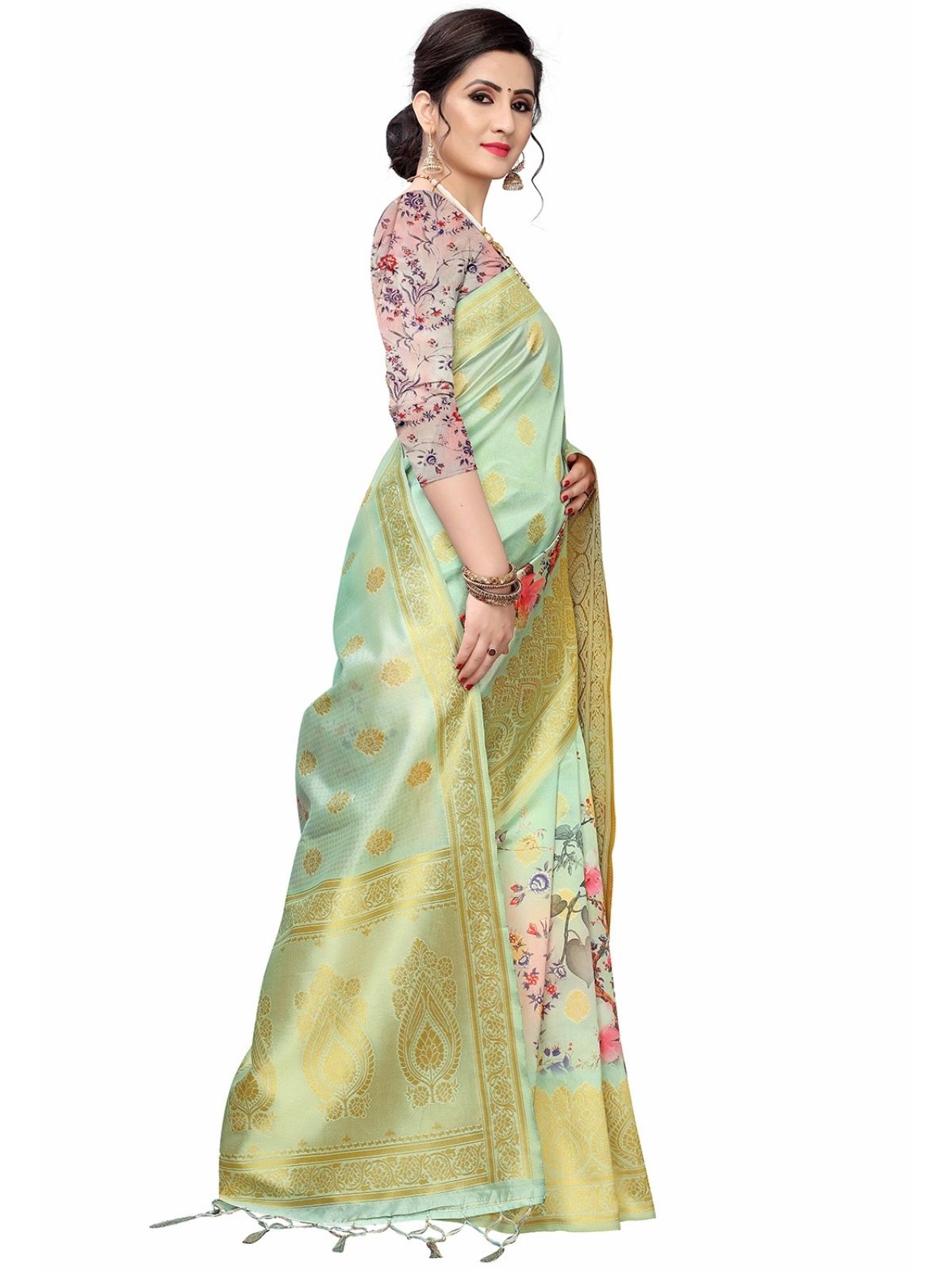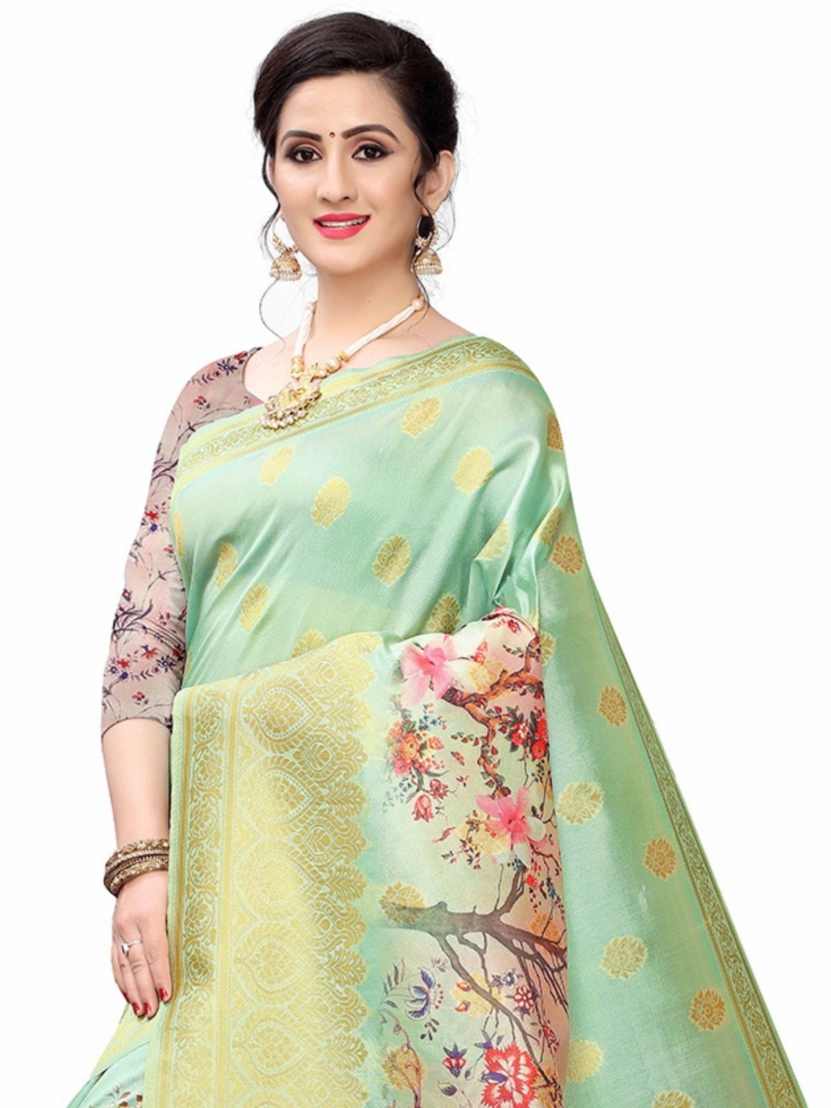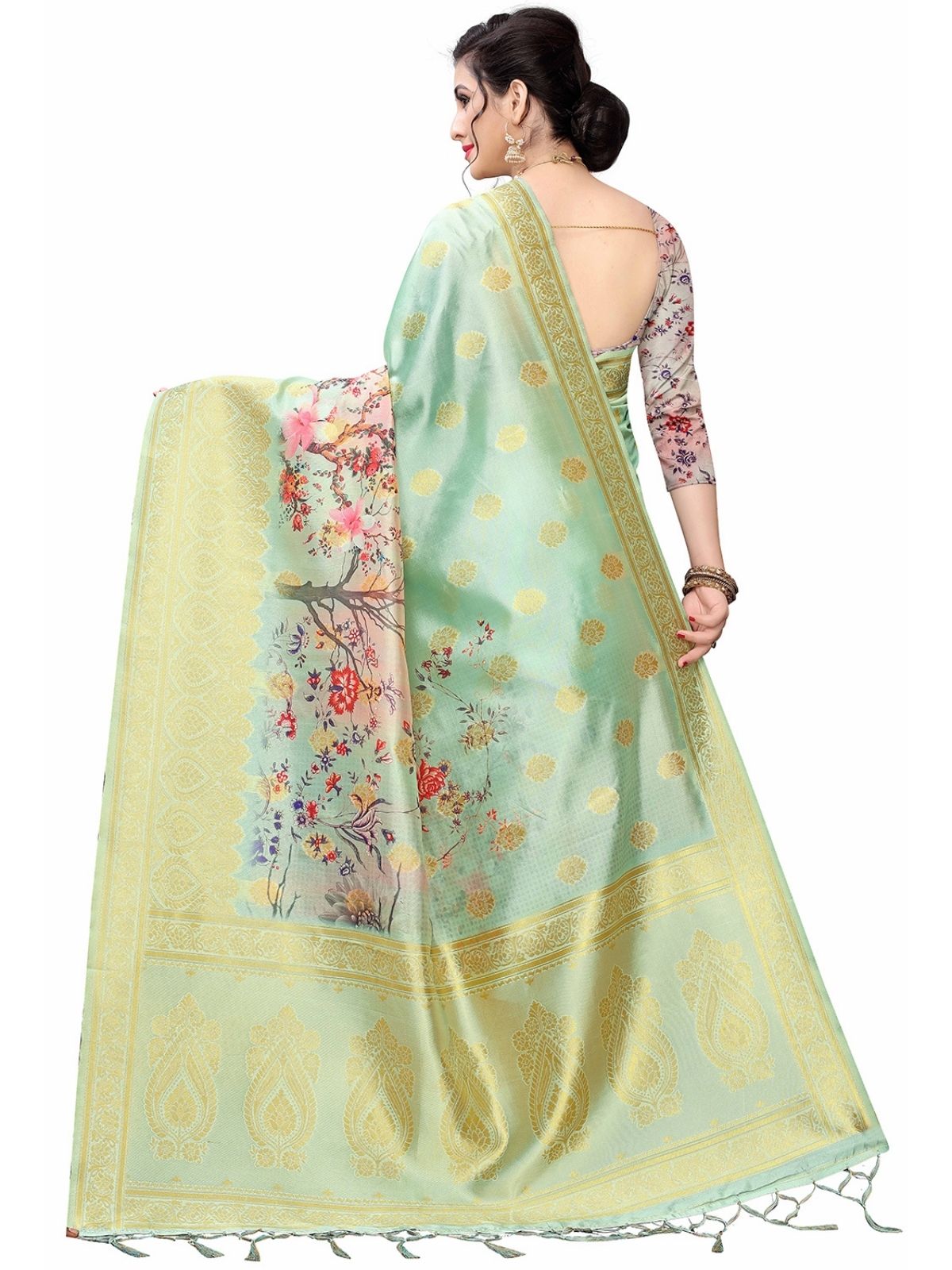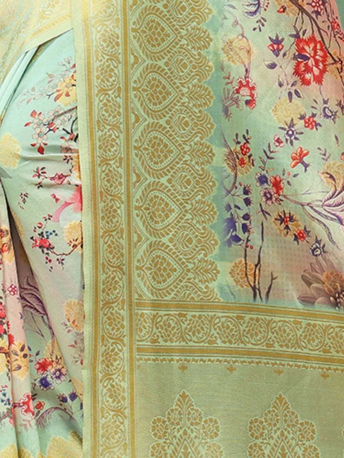 Odette Sea Green Silk Blend Floral Printed Saree For Women