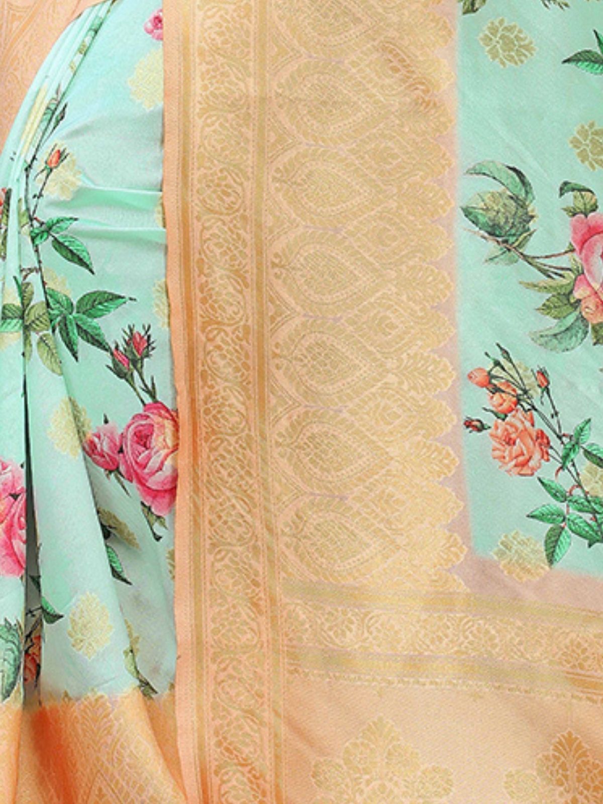 Odette Sea Green Silk Blend Floral Printed Saree For Women
