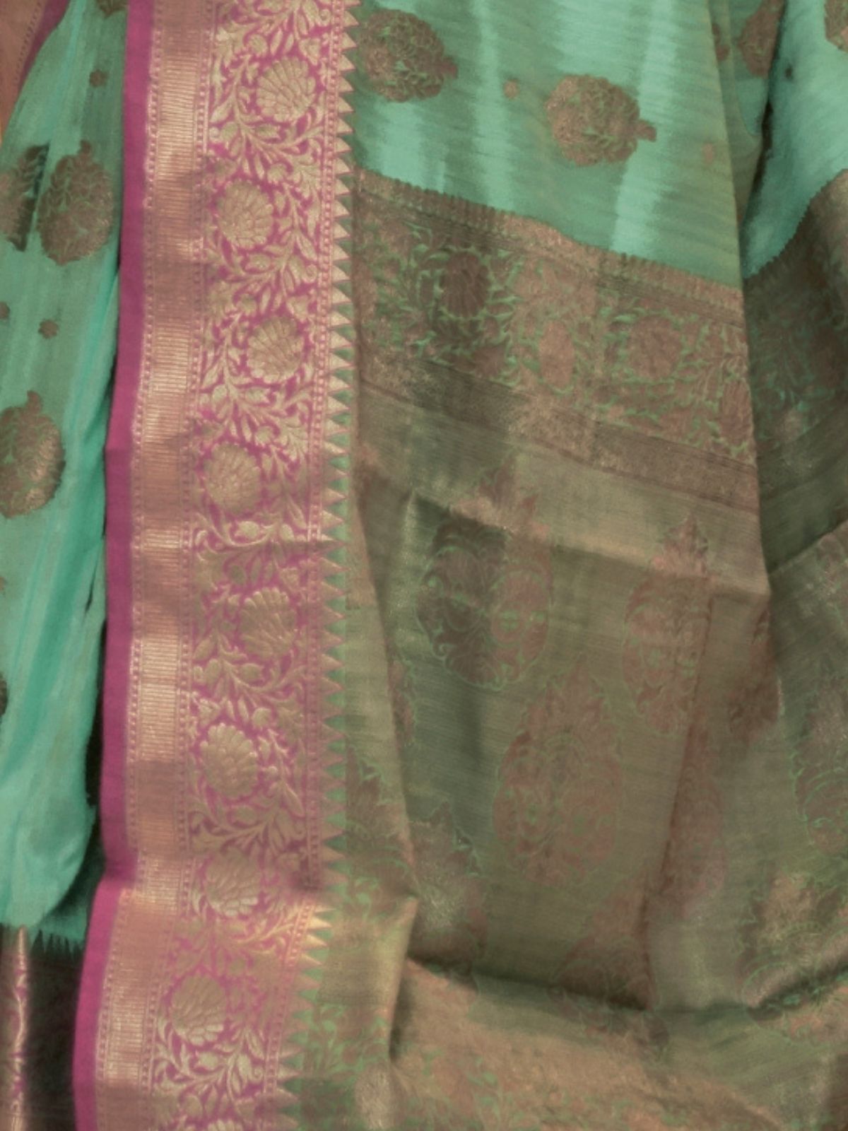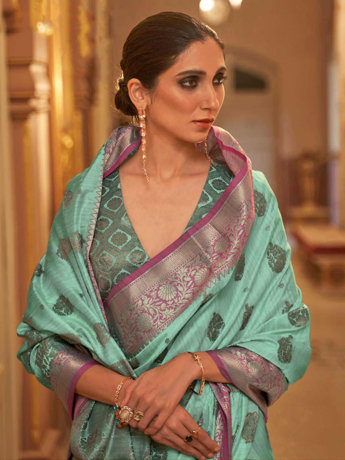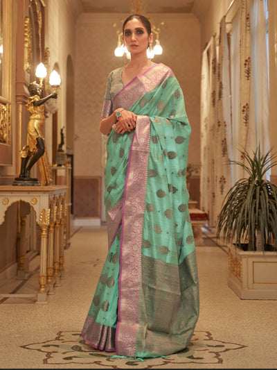 Odette Sea Green Woven Design Silk Blend Saree With Unstitched Blouse For Women