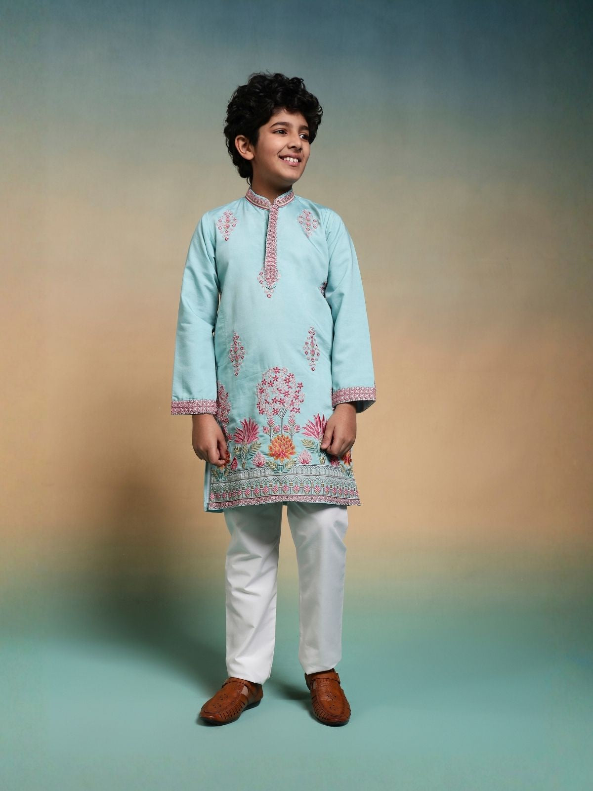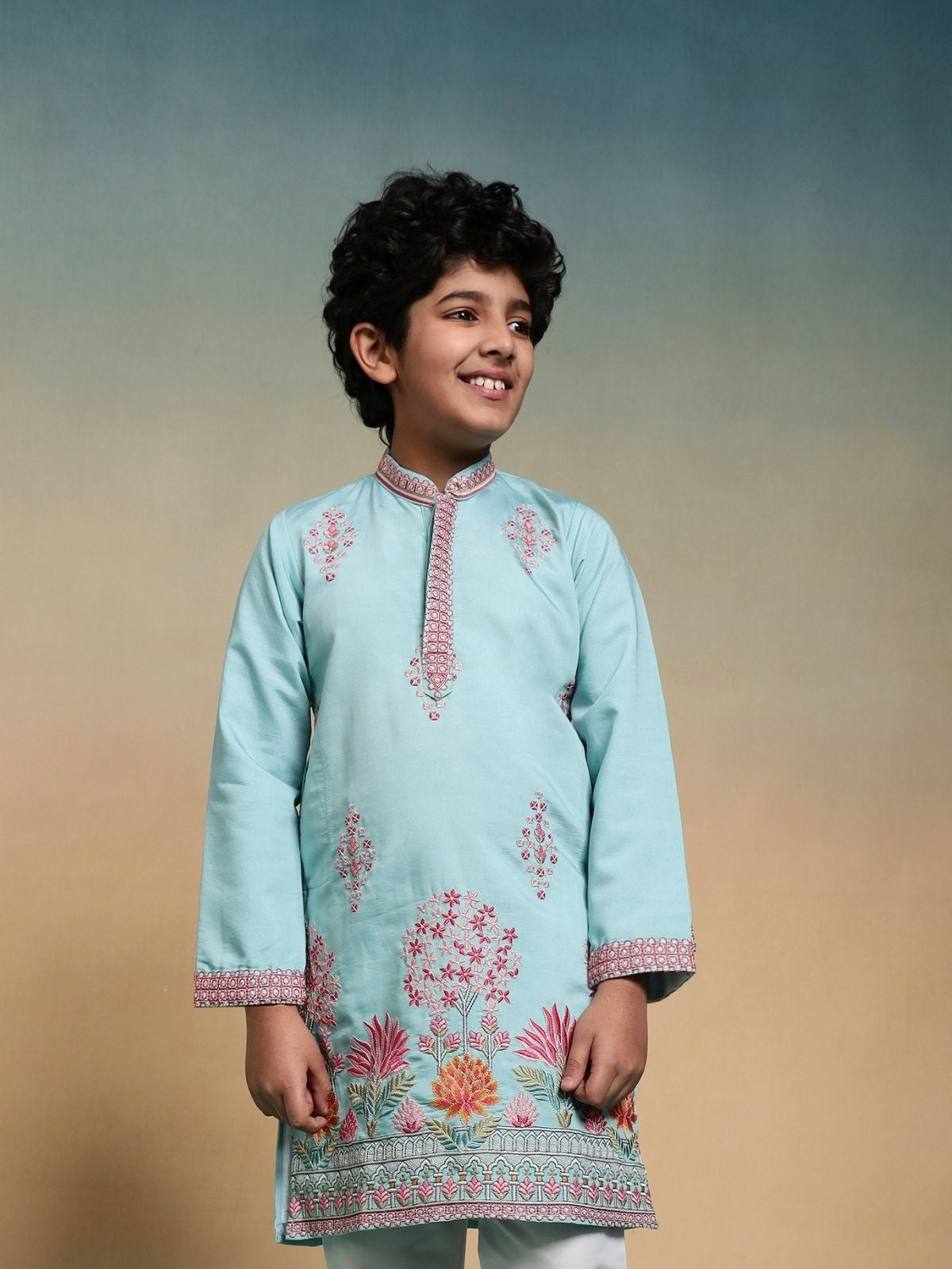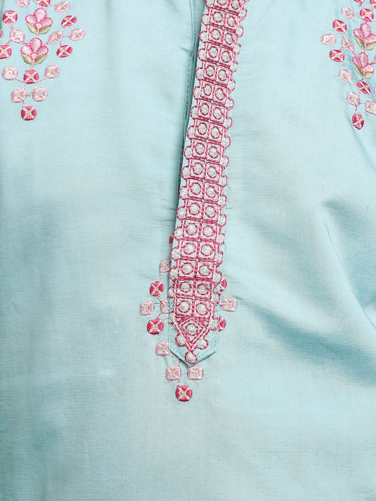 Odette Sky Blue Viscose Silk Embroidered Stitched Kurta Set For Kids
