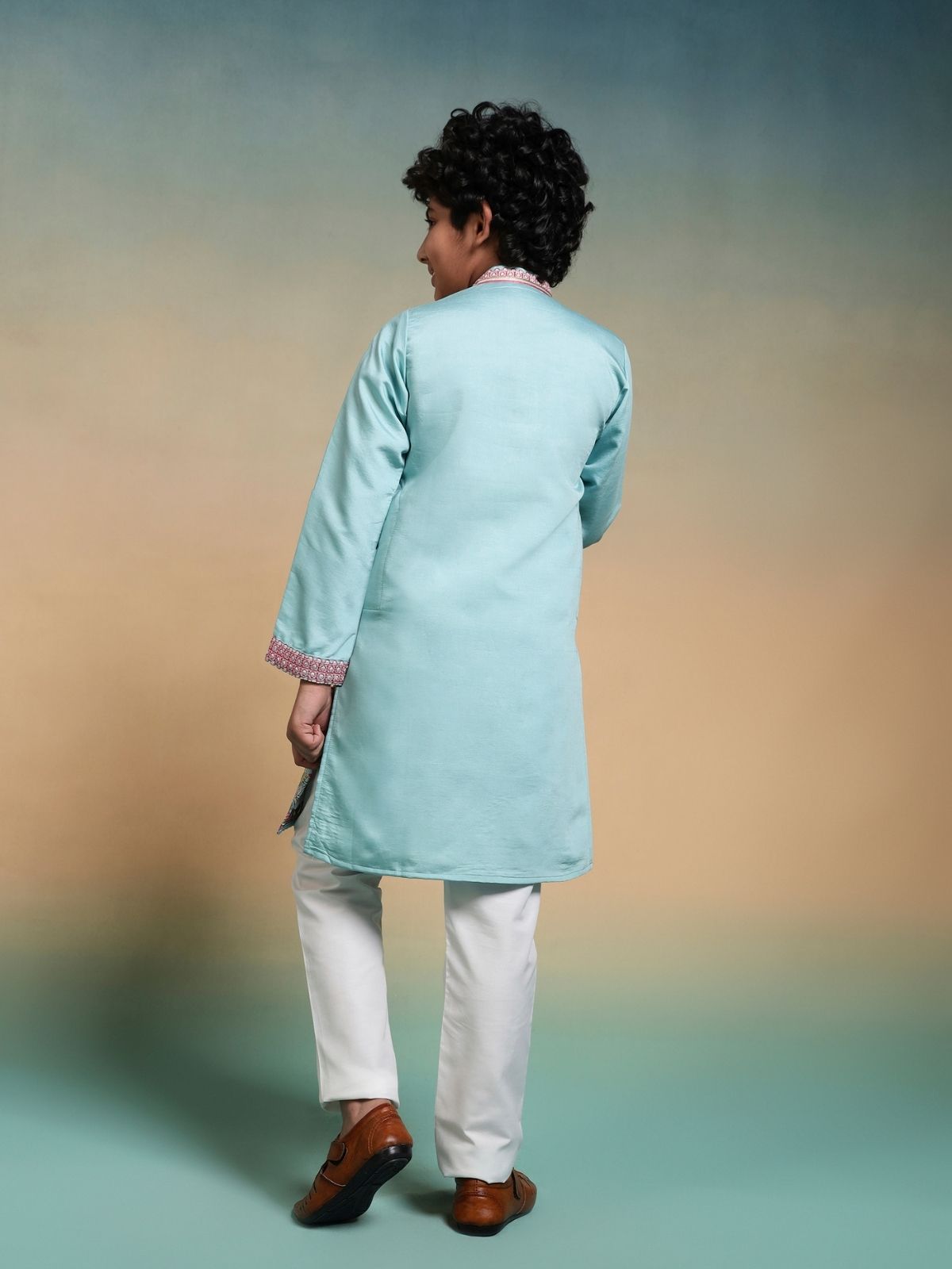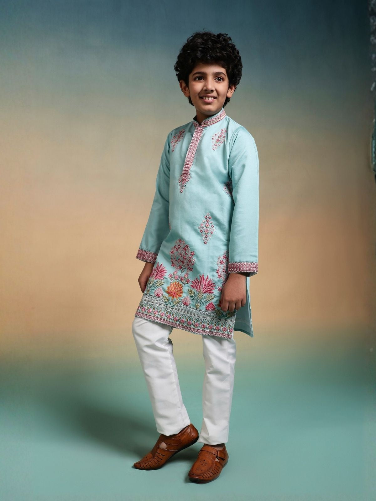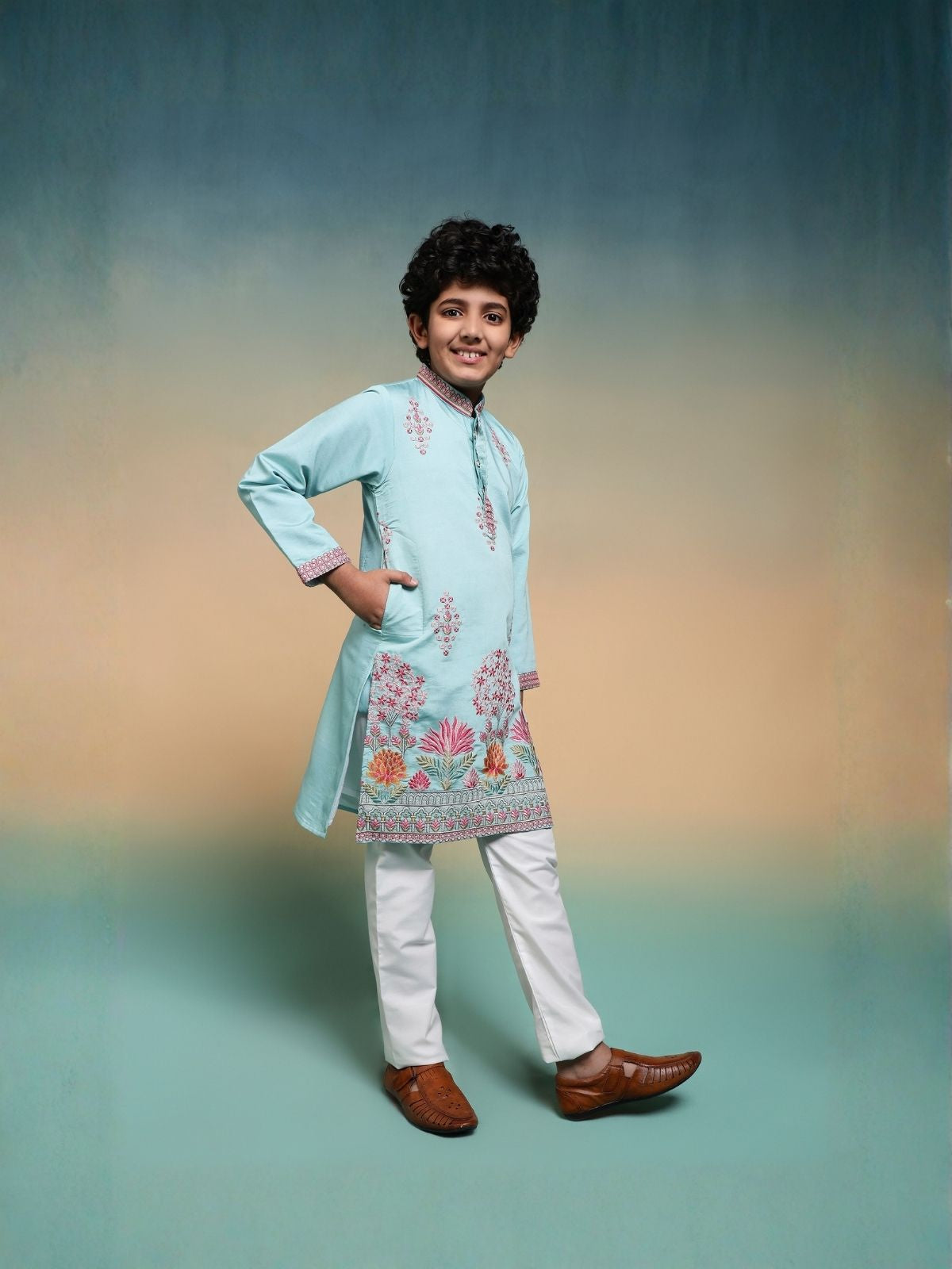 Odette Sky Blue Viscose Silk Embroidered Stitched Kurta Set For Kids