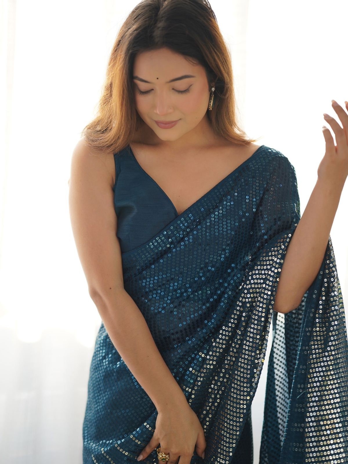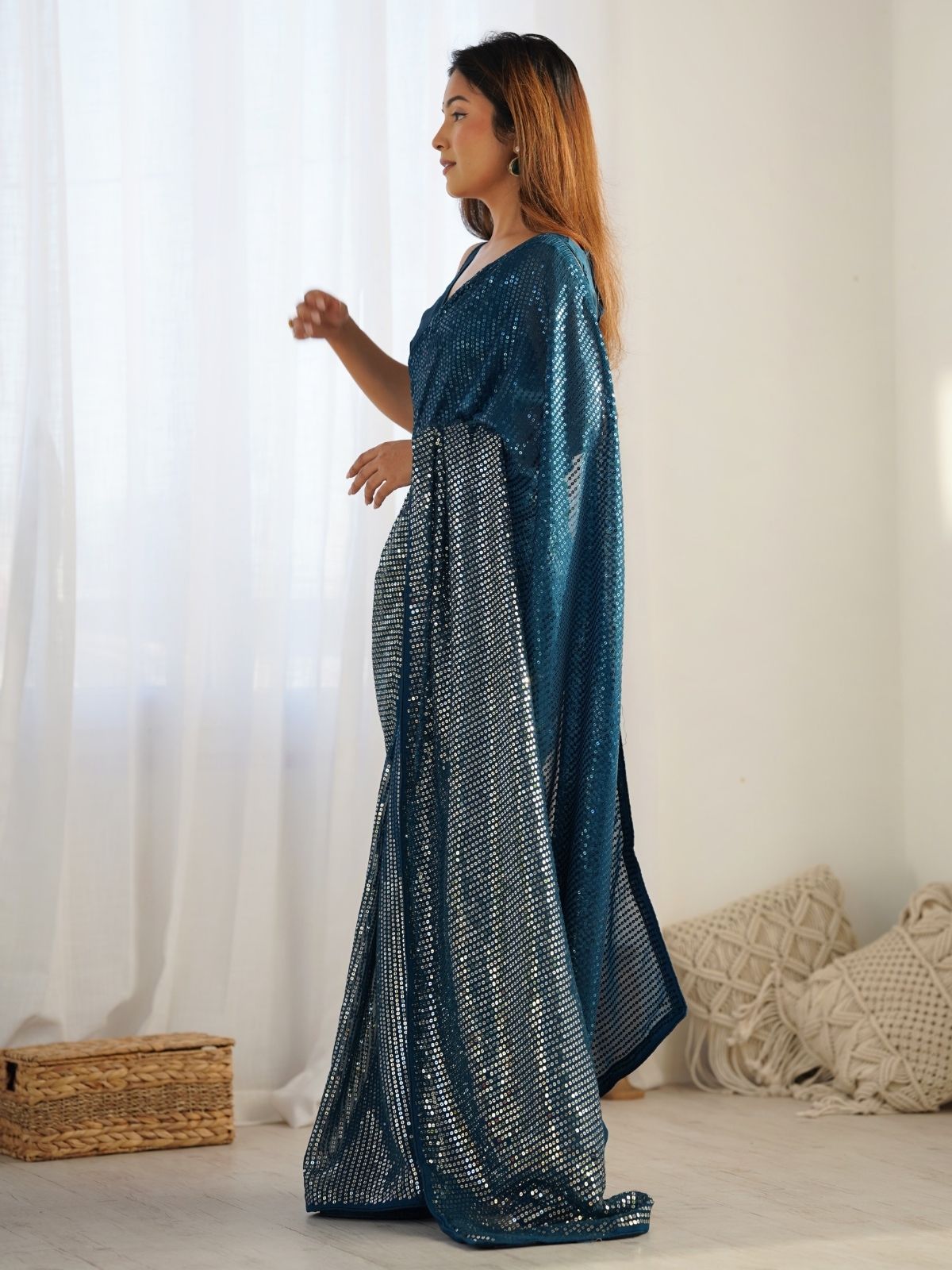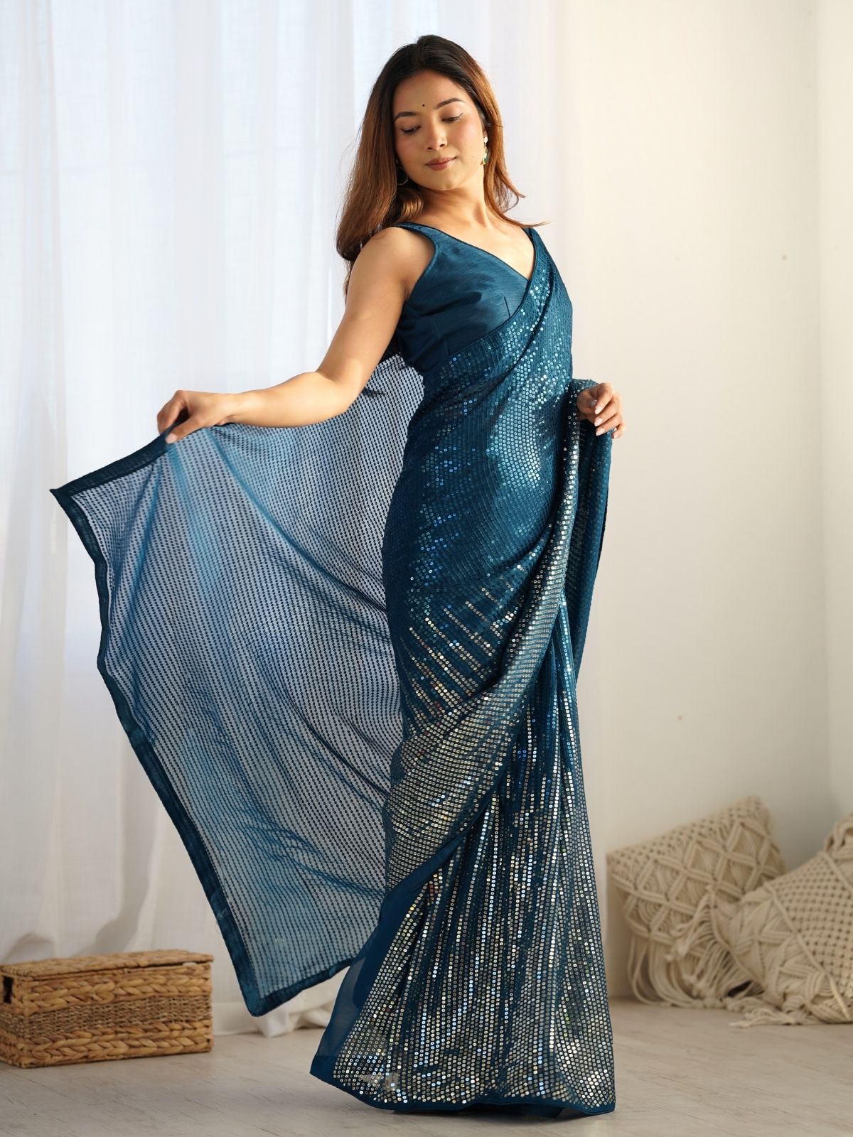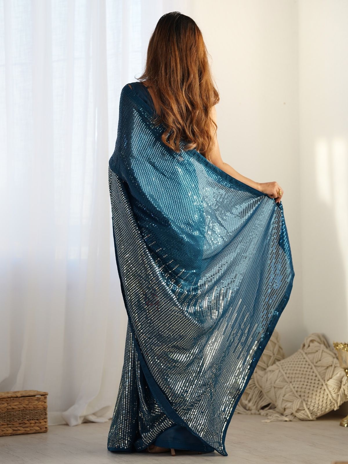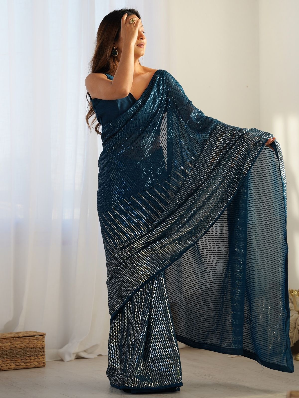 Odette Teal Blue Georgette Embellished Saree With Unstitched Blouse For Women