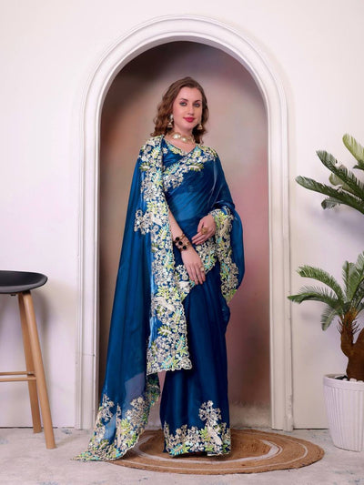 Odette Teal Blue Jimmy Choo Embellished Saree For Women