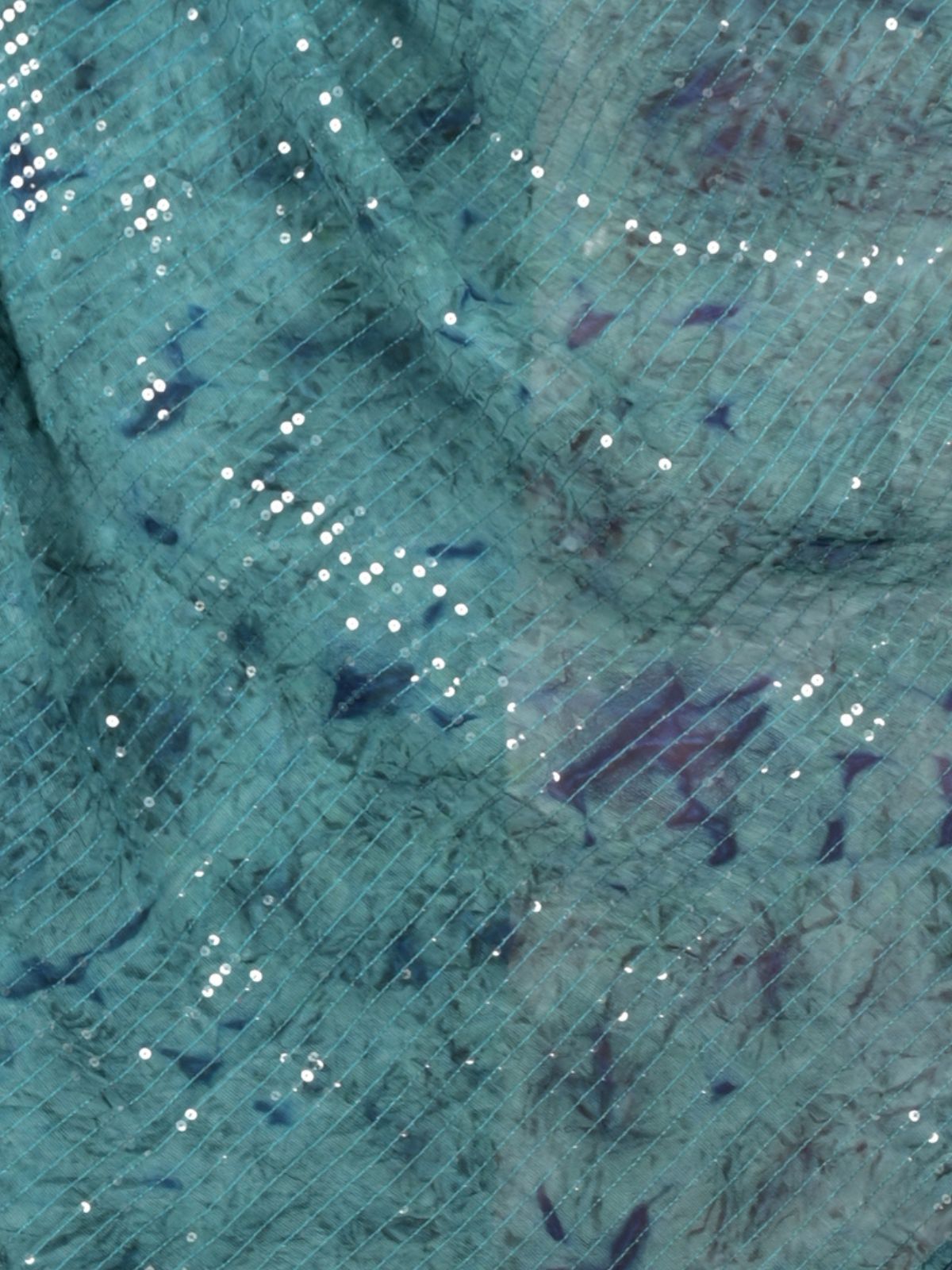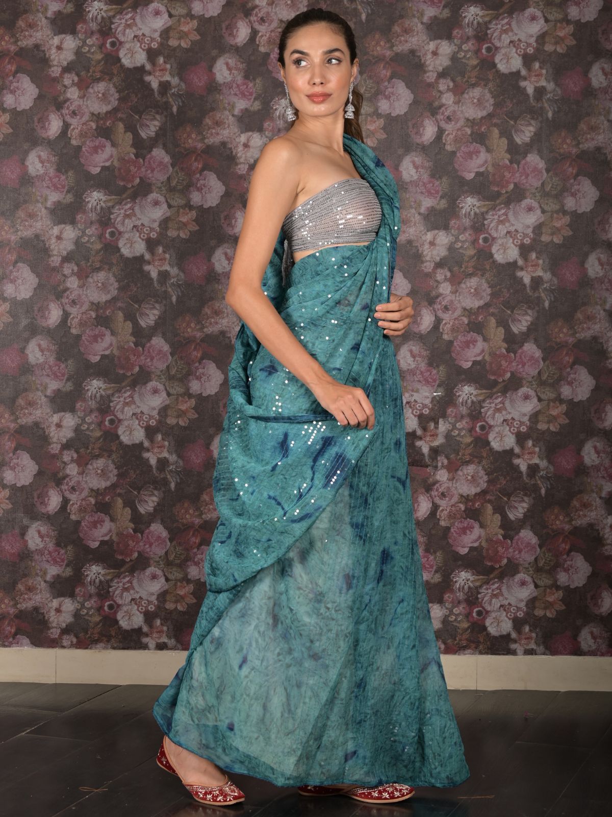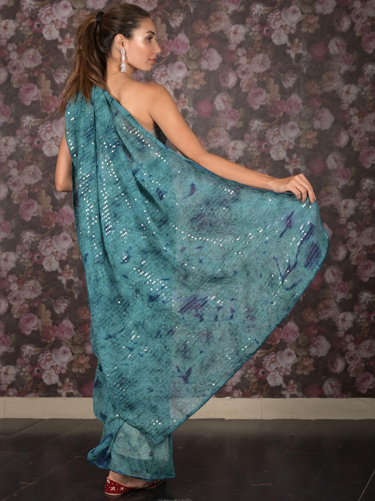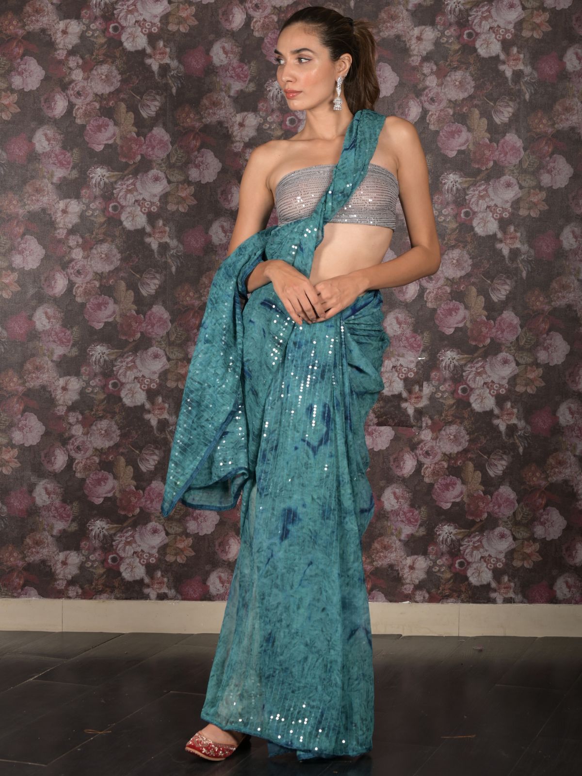 Odette Teal Sequins Embroidered Georgette Saree With Unstitched Blouse For Women