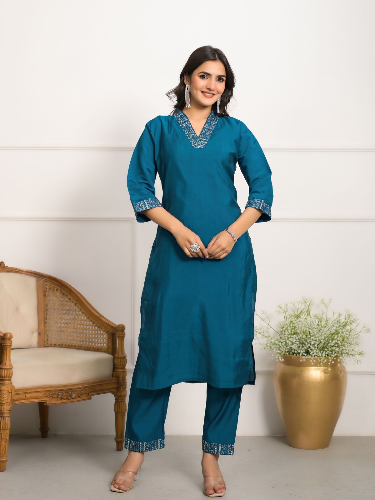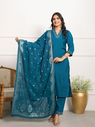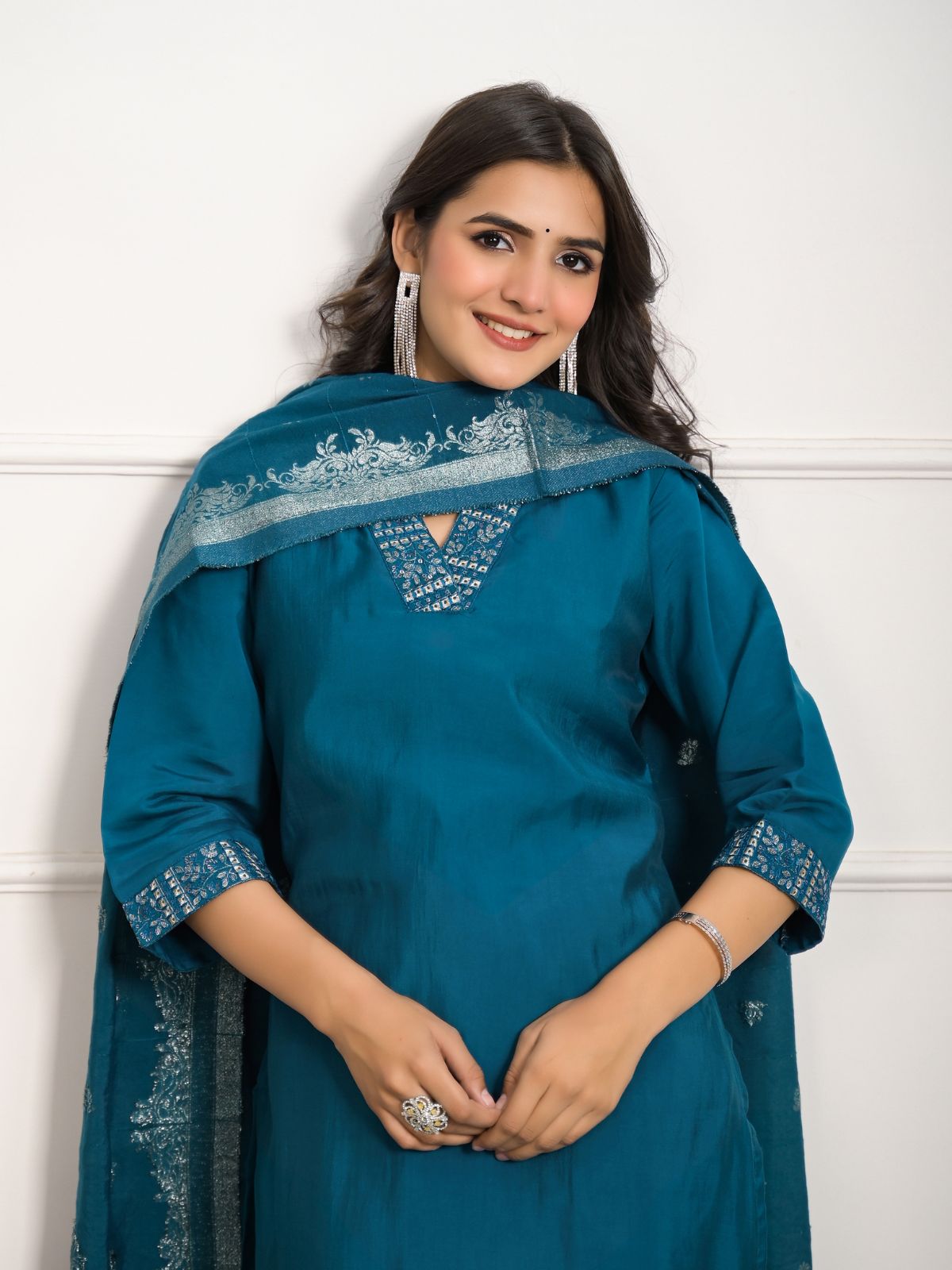 This Foil , Embroidered Kurta Set Is A Great Choice For Parties And Festivities. The Kurta Set Comes With Matching Lower And Dupatta. This One Looks Great With A Pair Of Danglers And Heels.