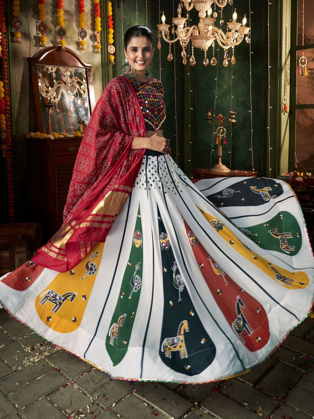 • Lehenga Work: Printed And Mirror Work