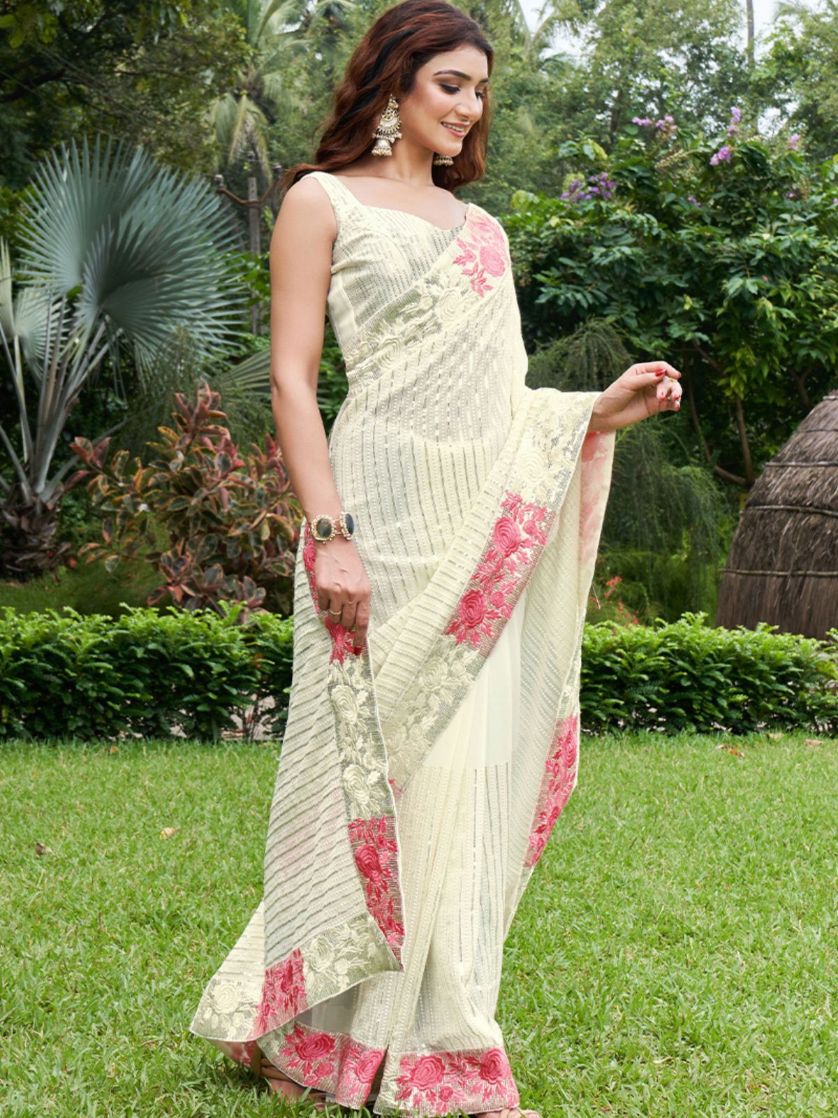 Odette White Georgette Embellished Saree with Unstitched Blouse for Women