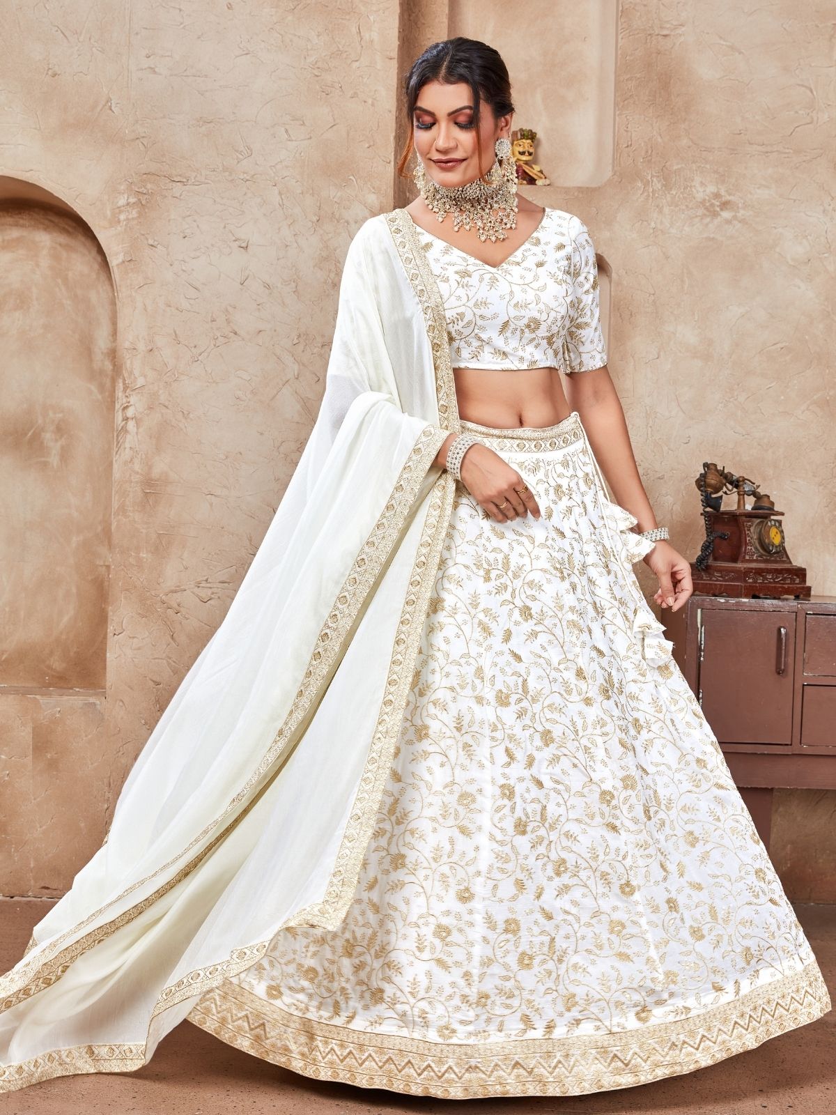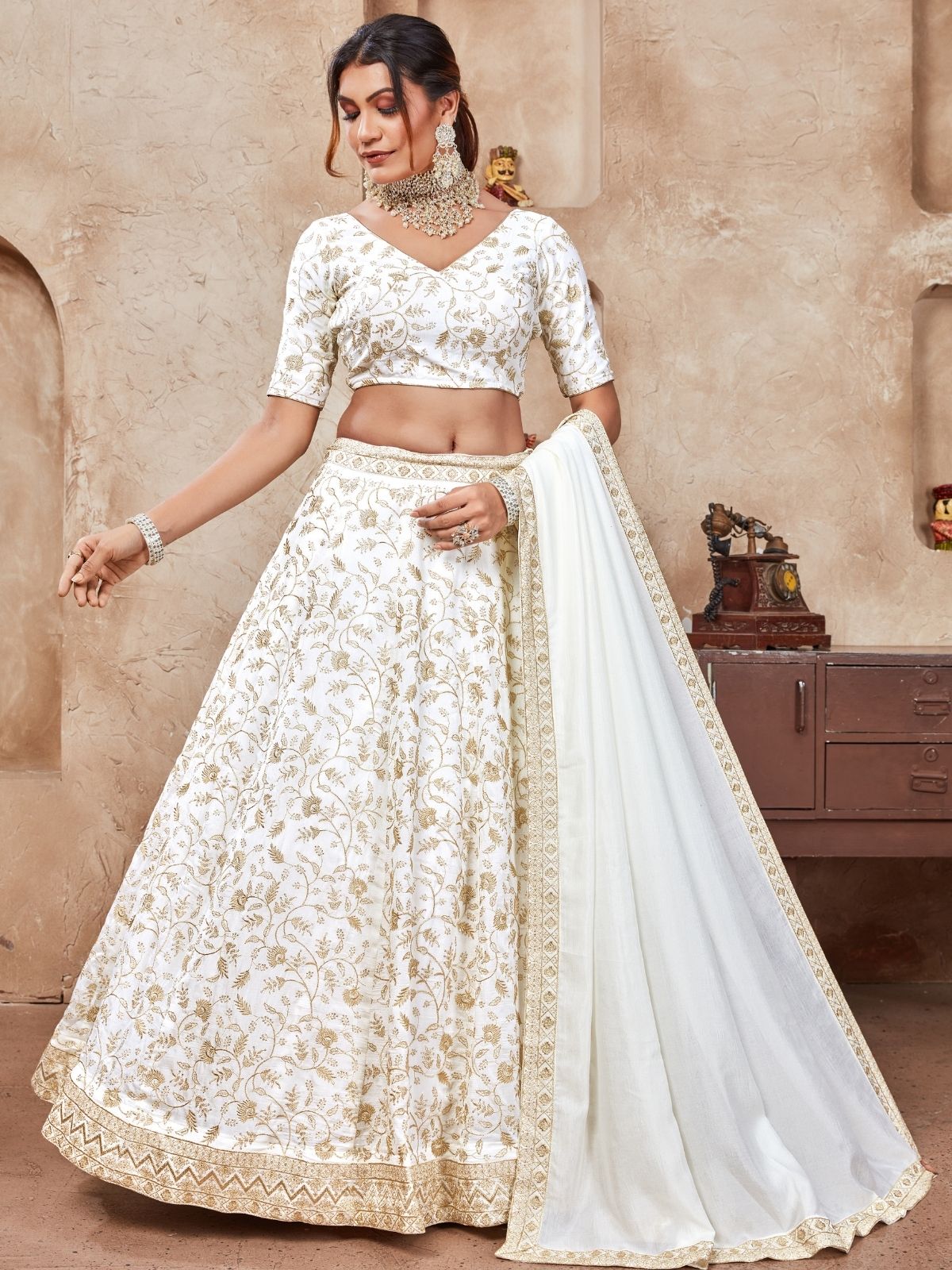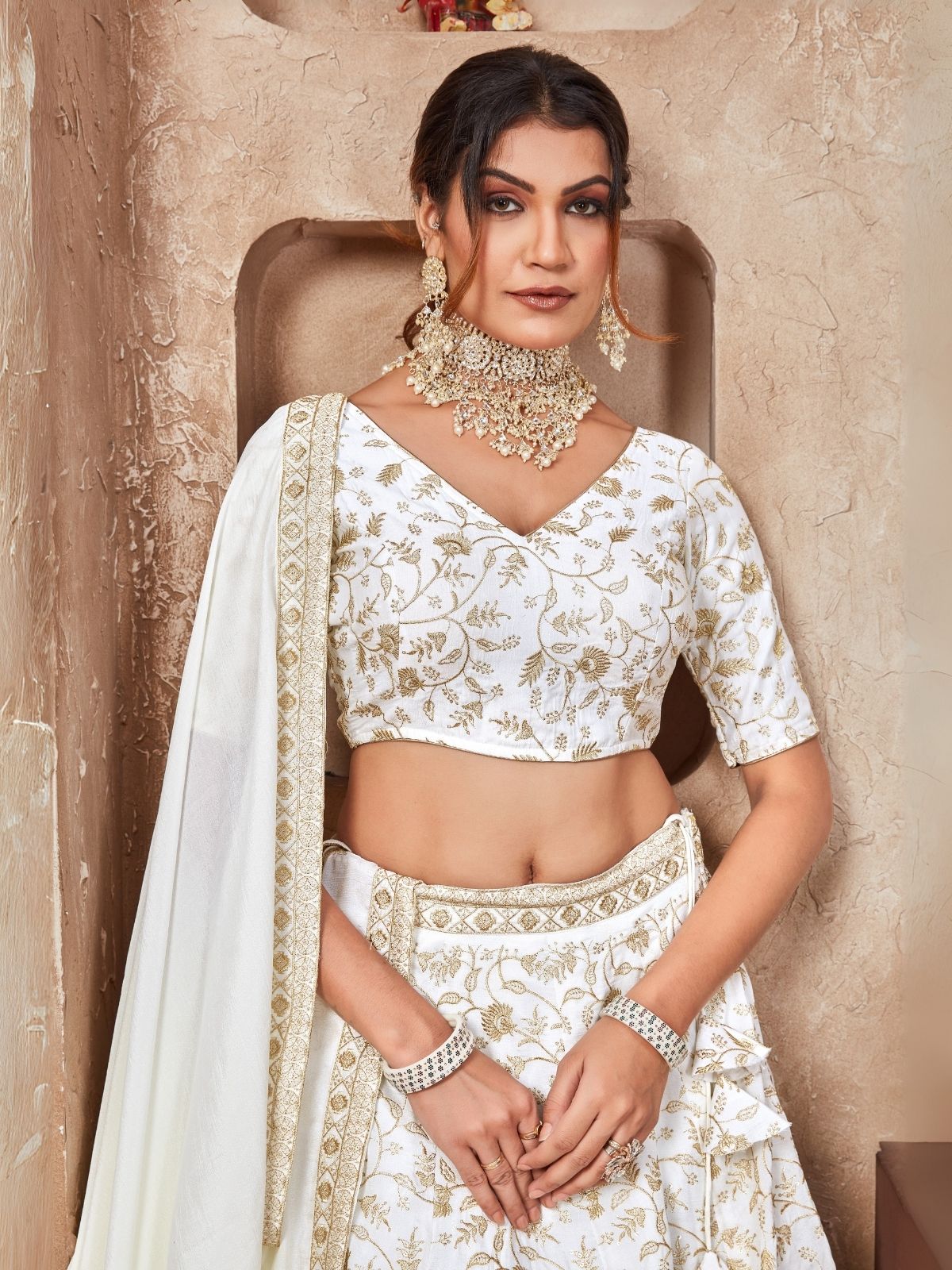 Odette White Silk Blend Embroidered Semi-Stitched Lehenga For Women