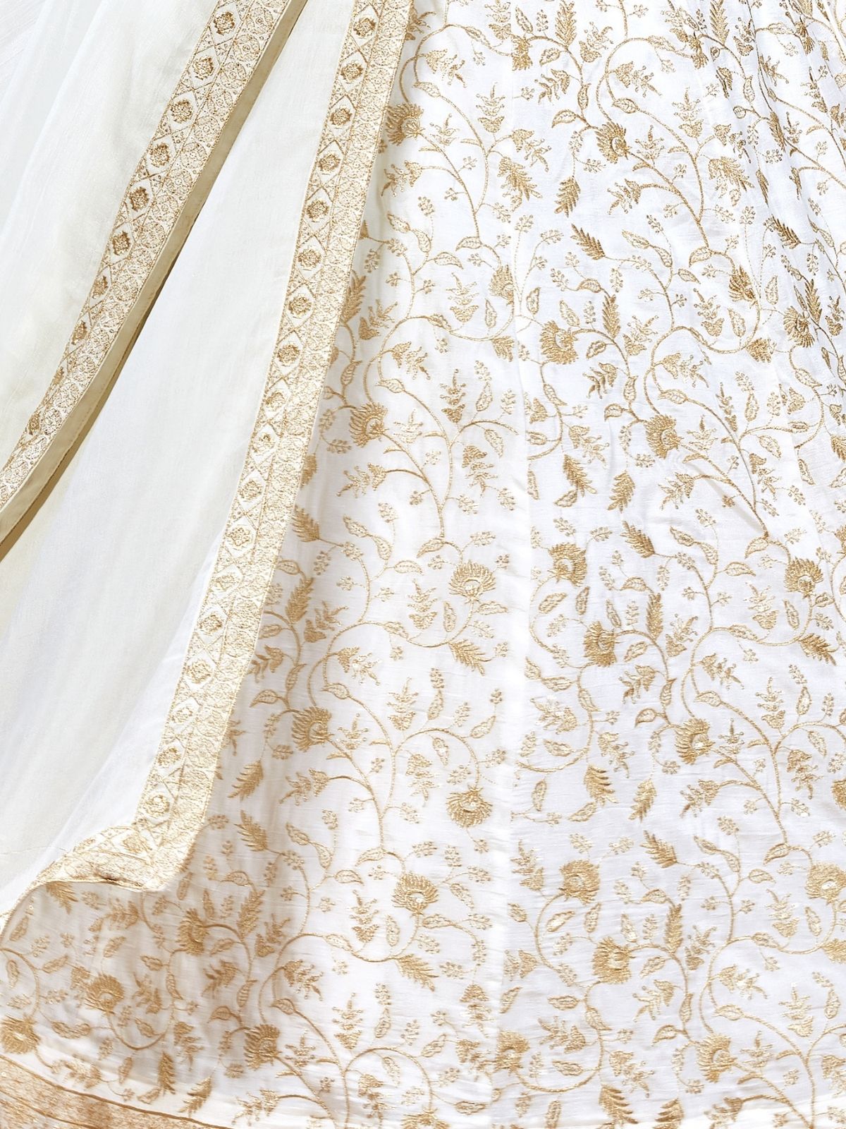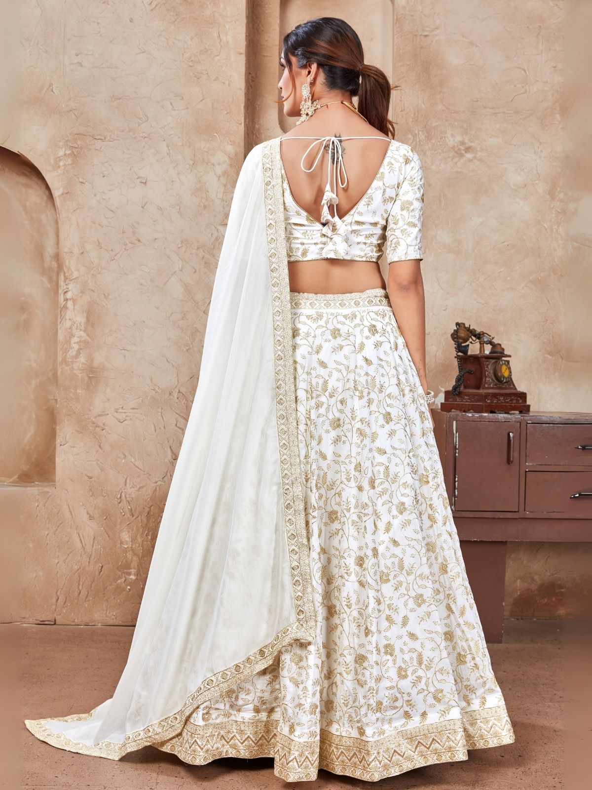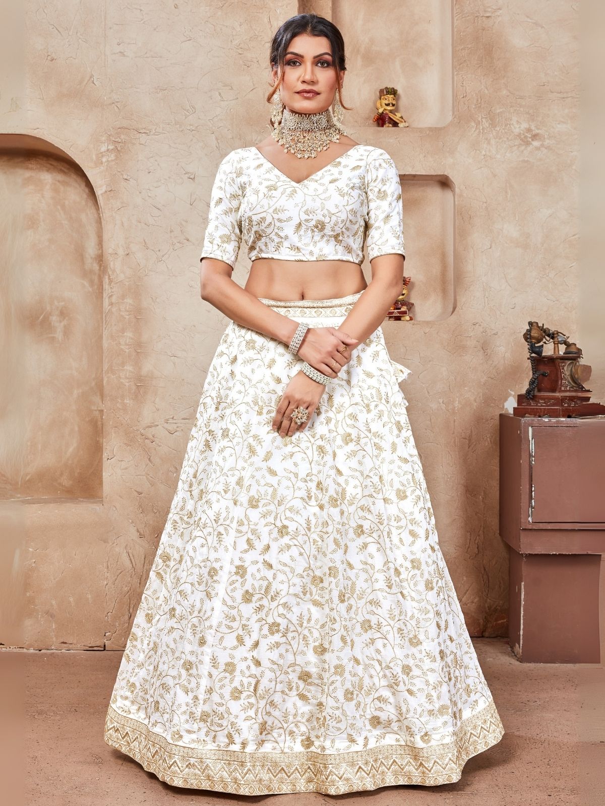 Odette White Silk Blend Embroidered Semi-Stitched Lehenga For Women