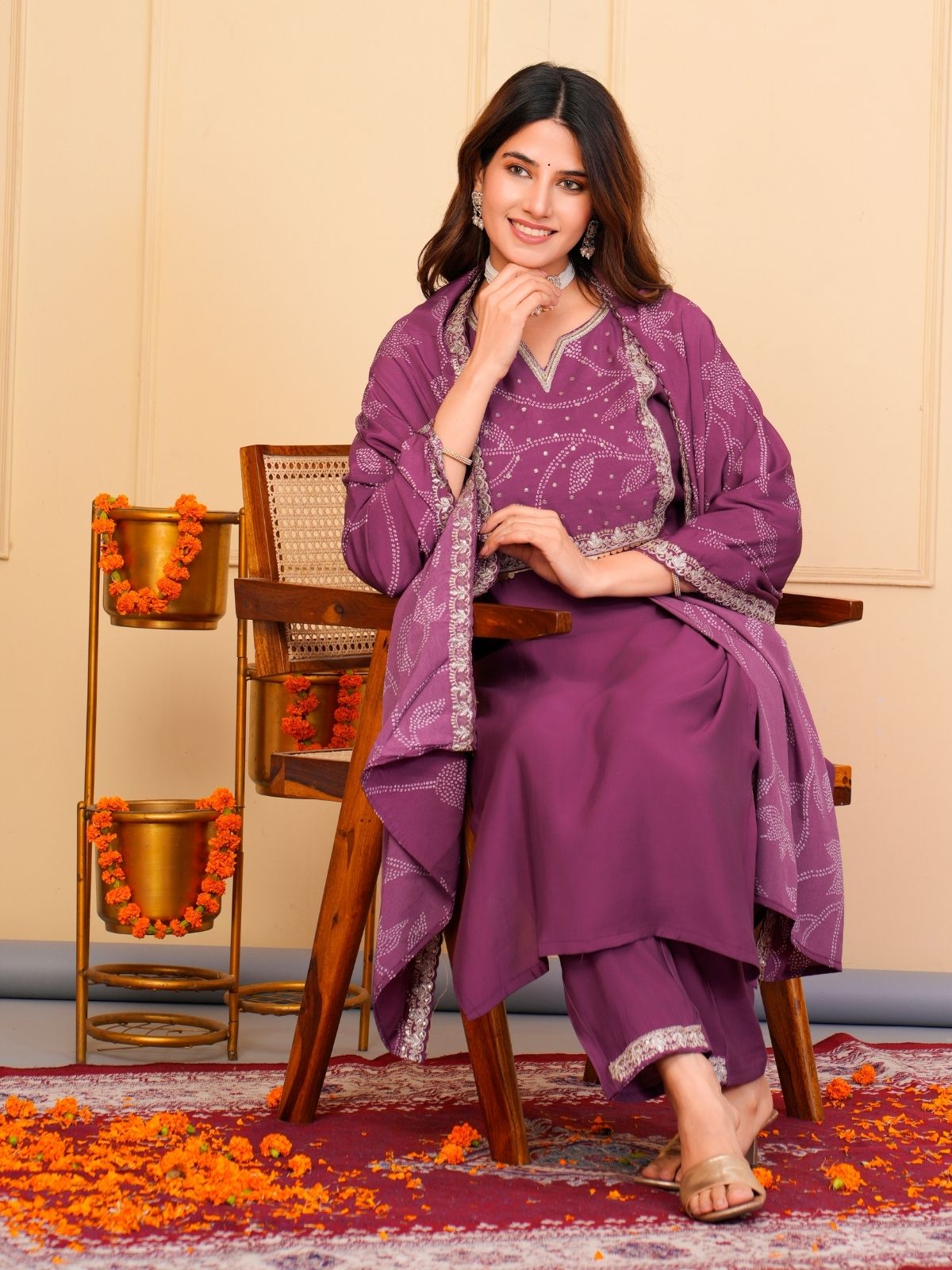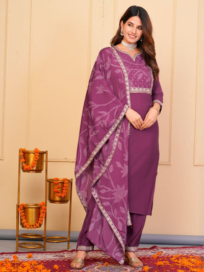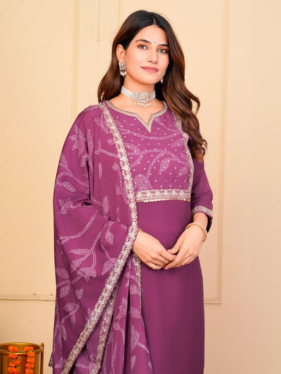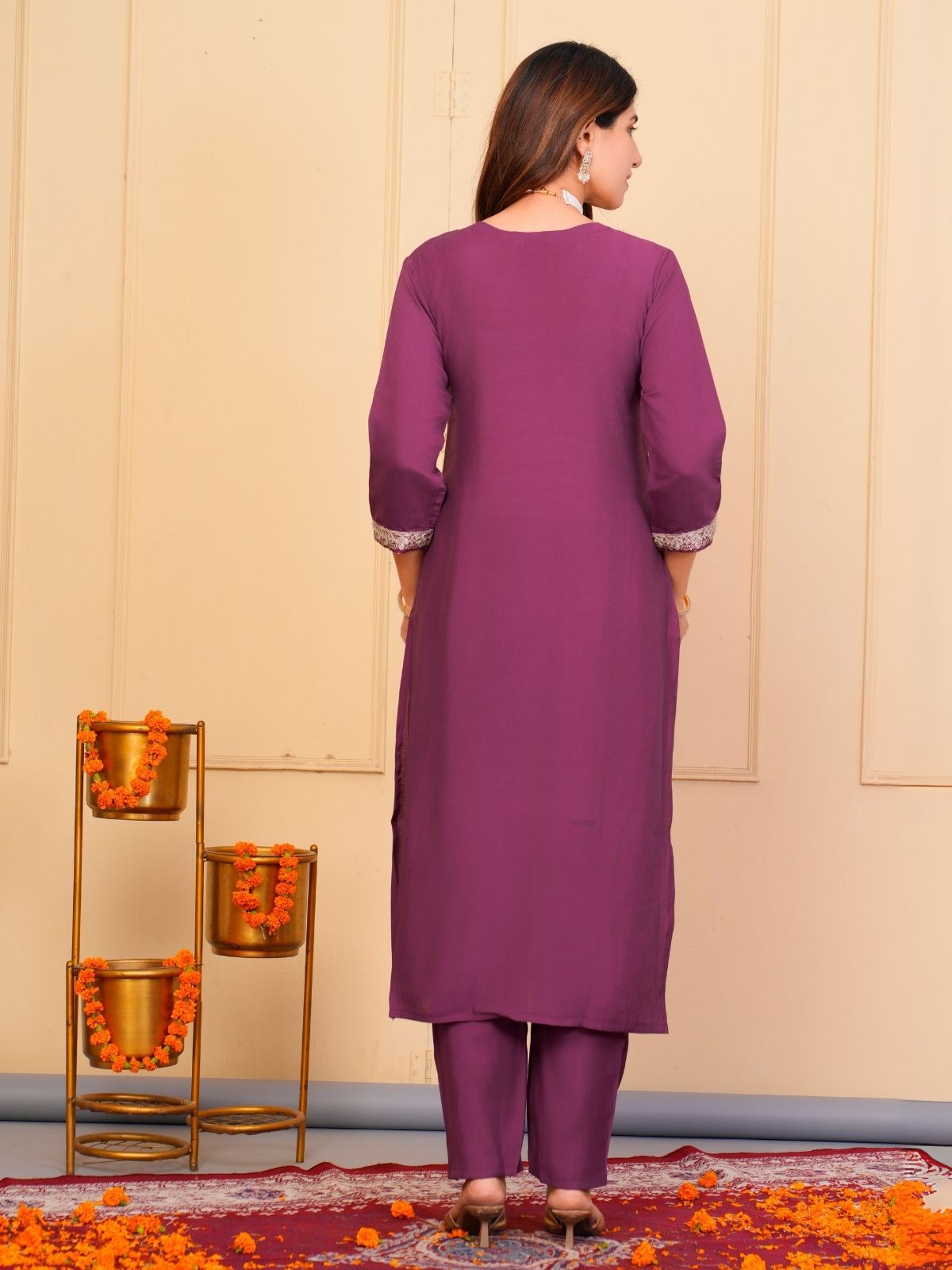 Odette Wine Viscose Embroidered Stitched Kurta Set For Women