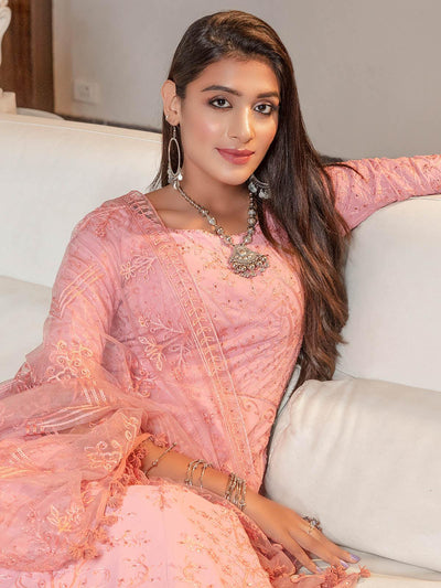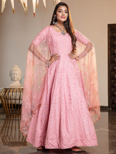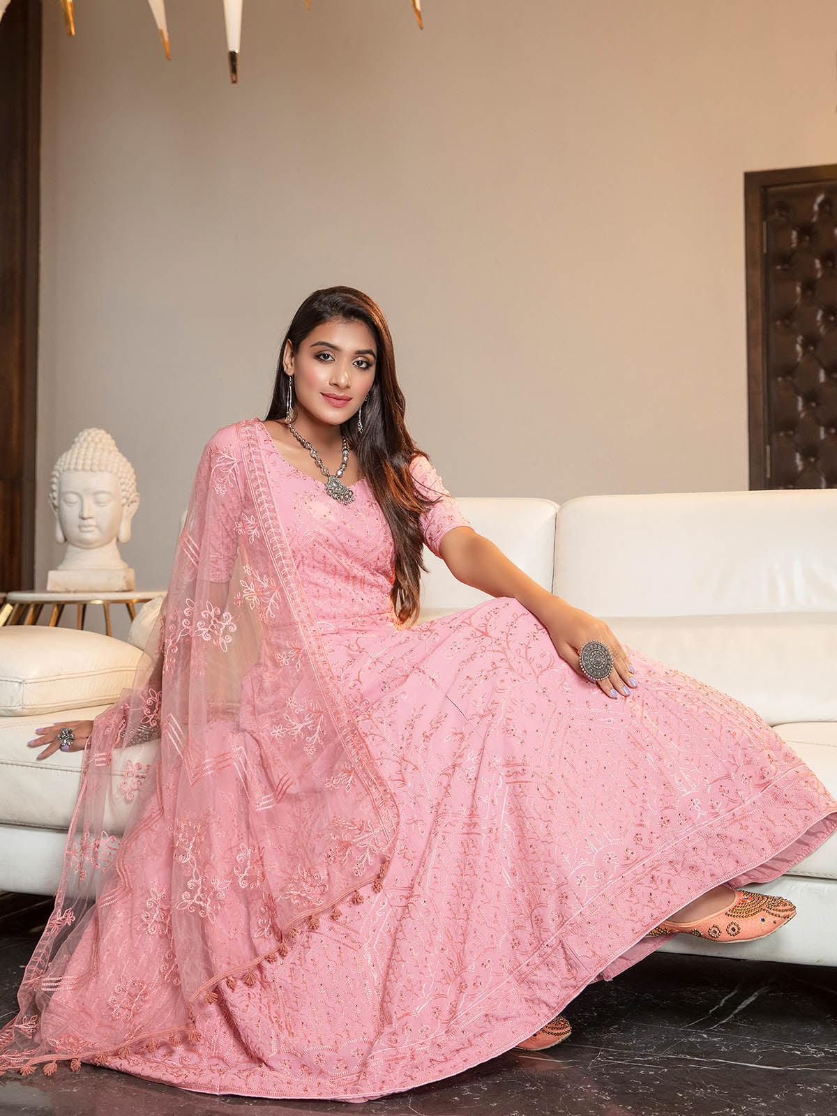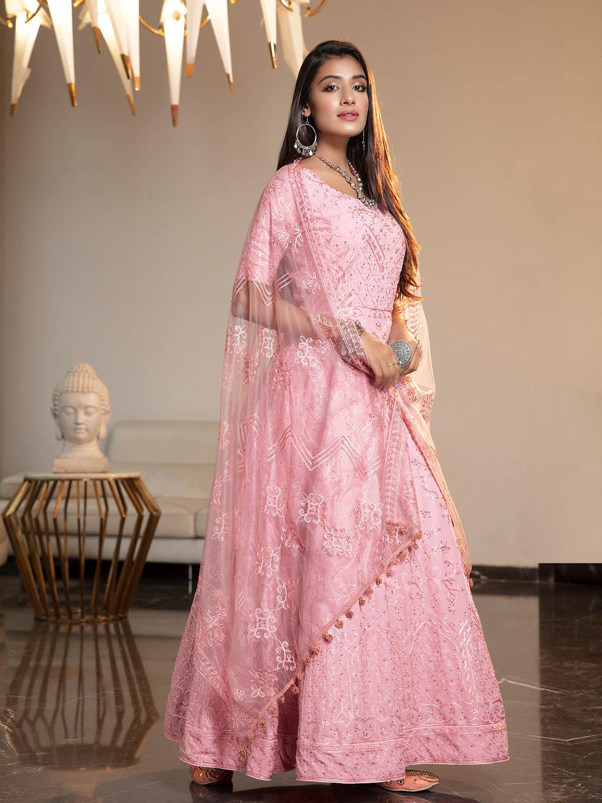 Dazzle in this Beautiful Diamond Georgette Net Floor Length Gown. The Designer Gown is Beautified With Thread and Stone Pasting Work, and is the perfect festive ensemble. Go for it girl.