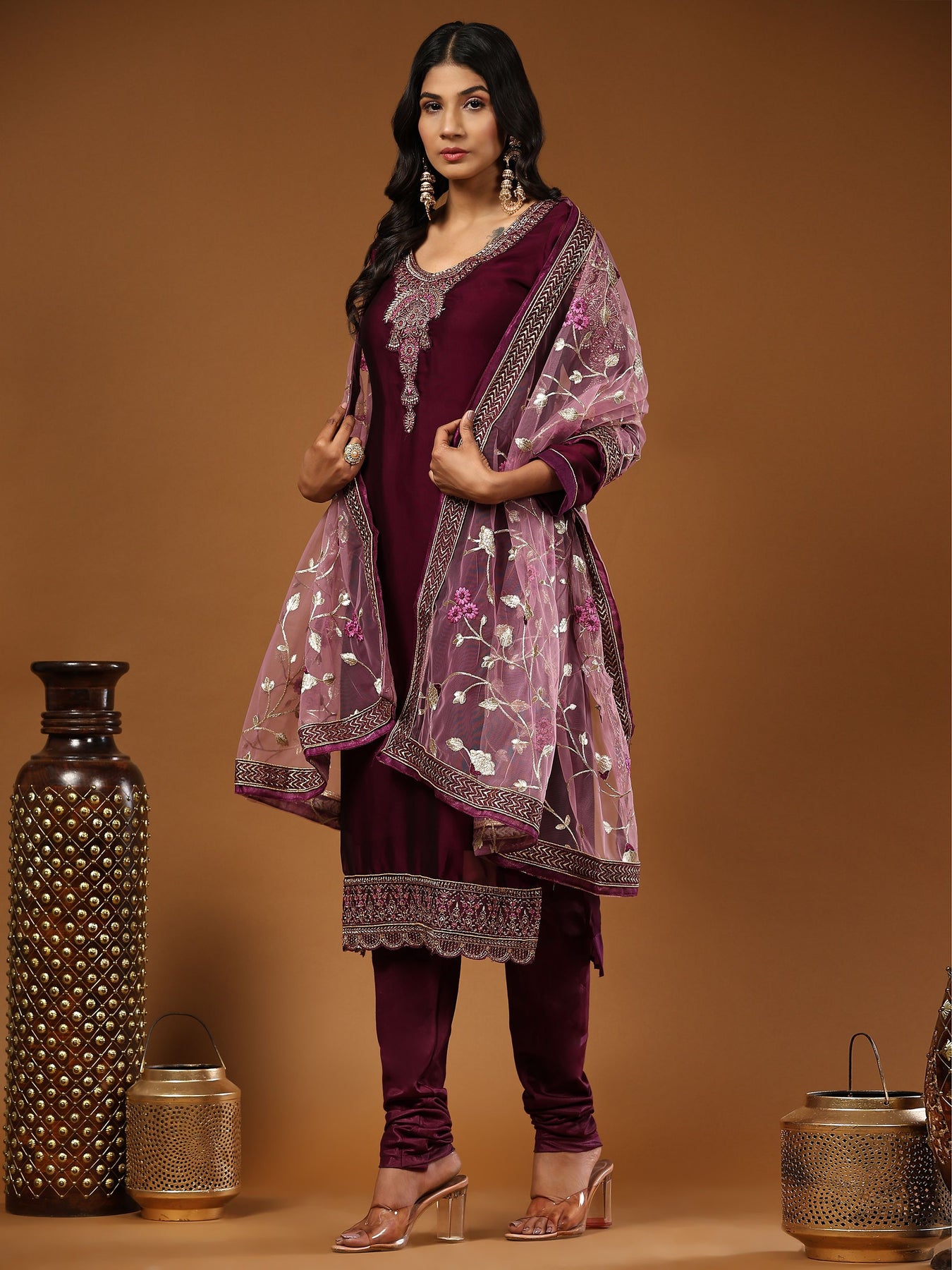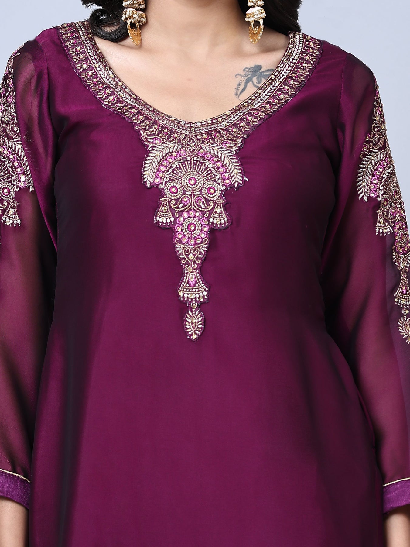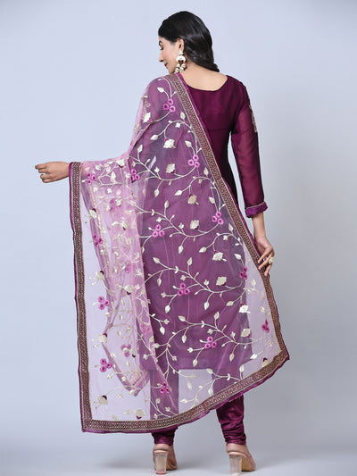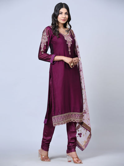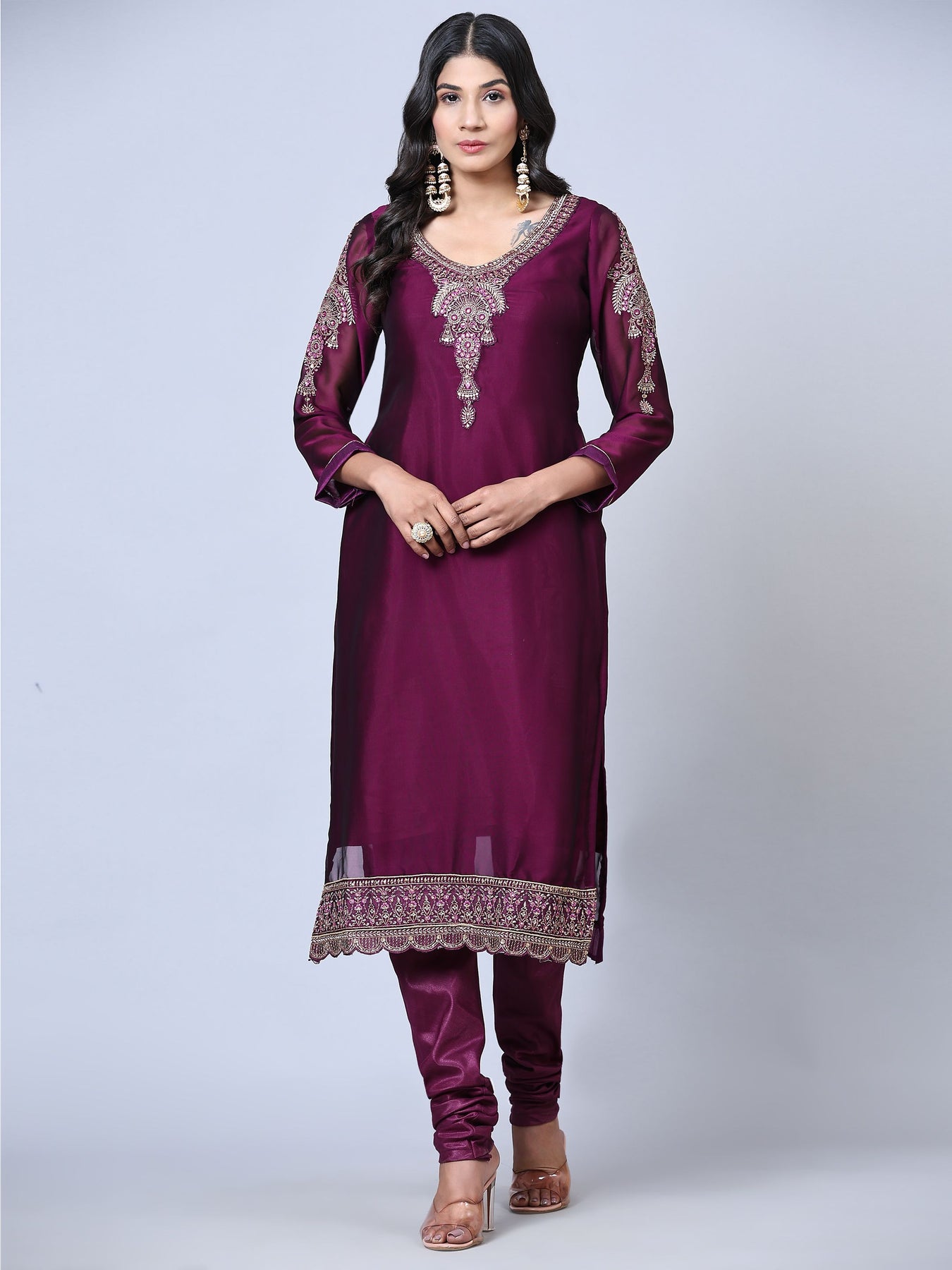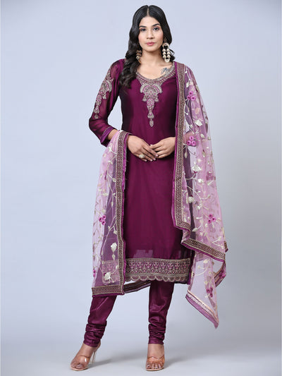 Include yourself into the glamour brigade of a season with this entrancing purple colored partywear suit. This georgette suit is beautified with stones and embroidered work on neckline. Also sleeves and hem are eye catching. The kurta set comes with matching unstitched santoon bottom, santoon lining and beautiful embroidered netted dupatta to complete the look. It's a perfect suit to wear for family functions, festivals and occasions.