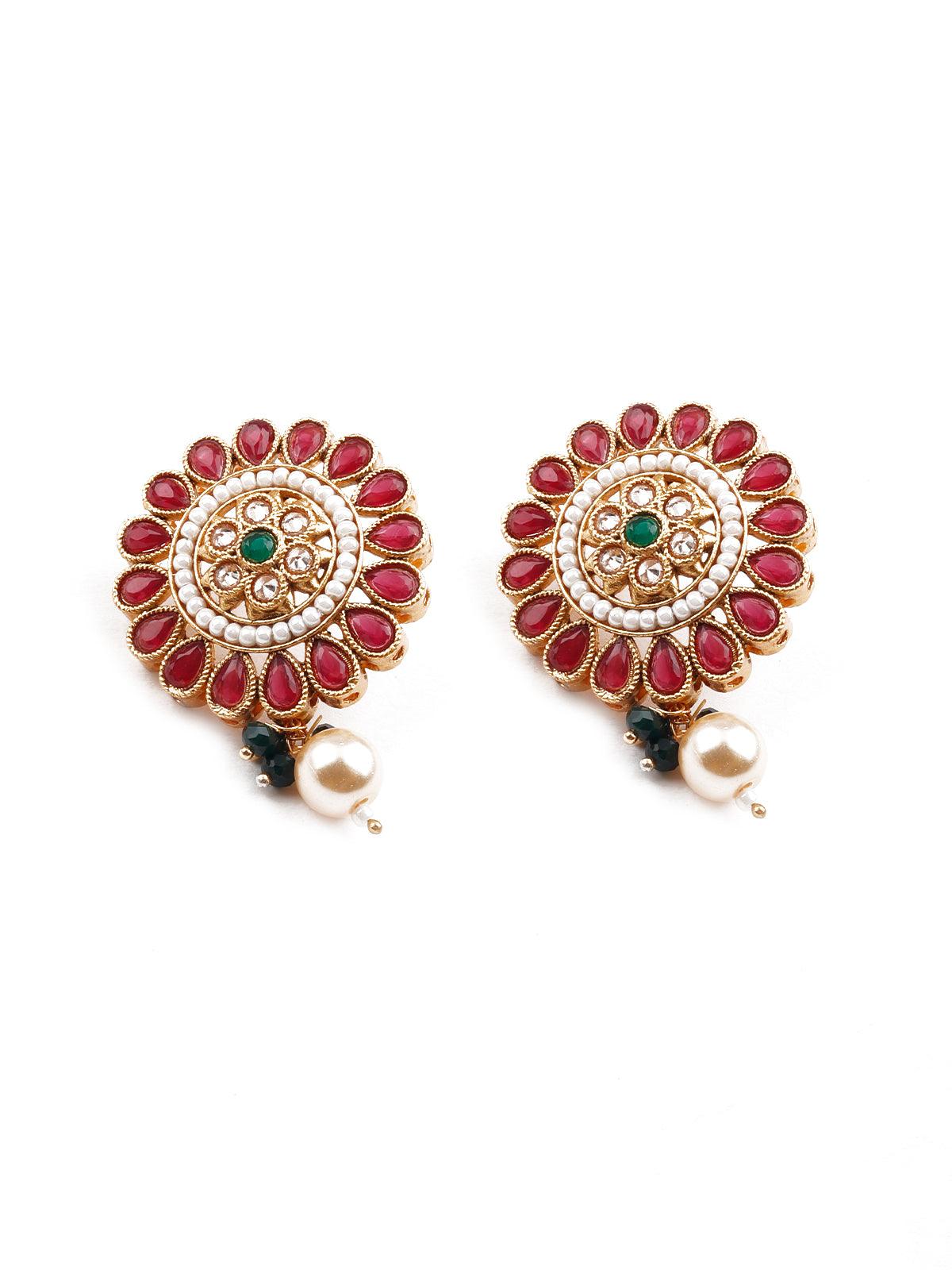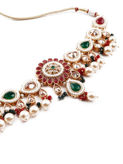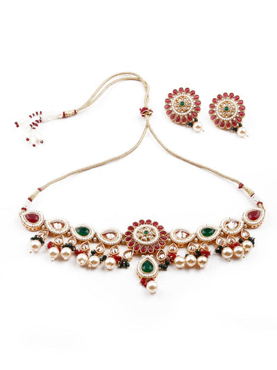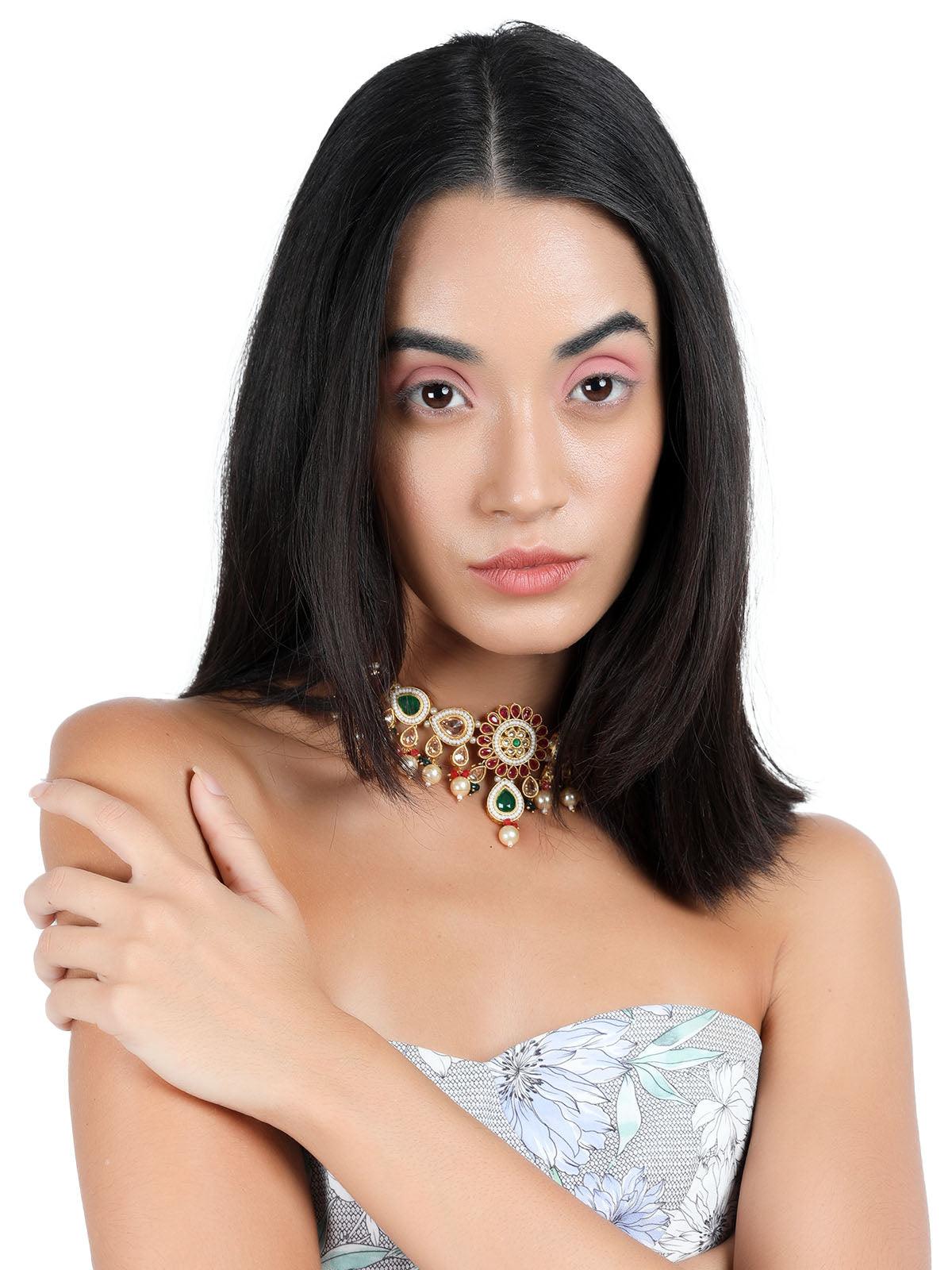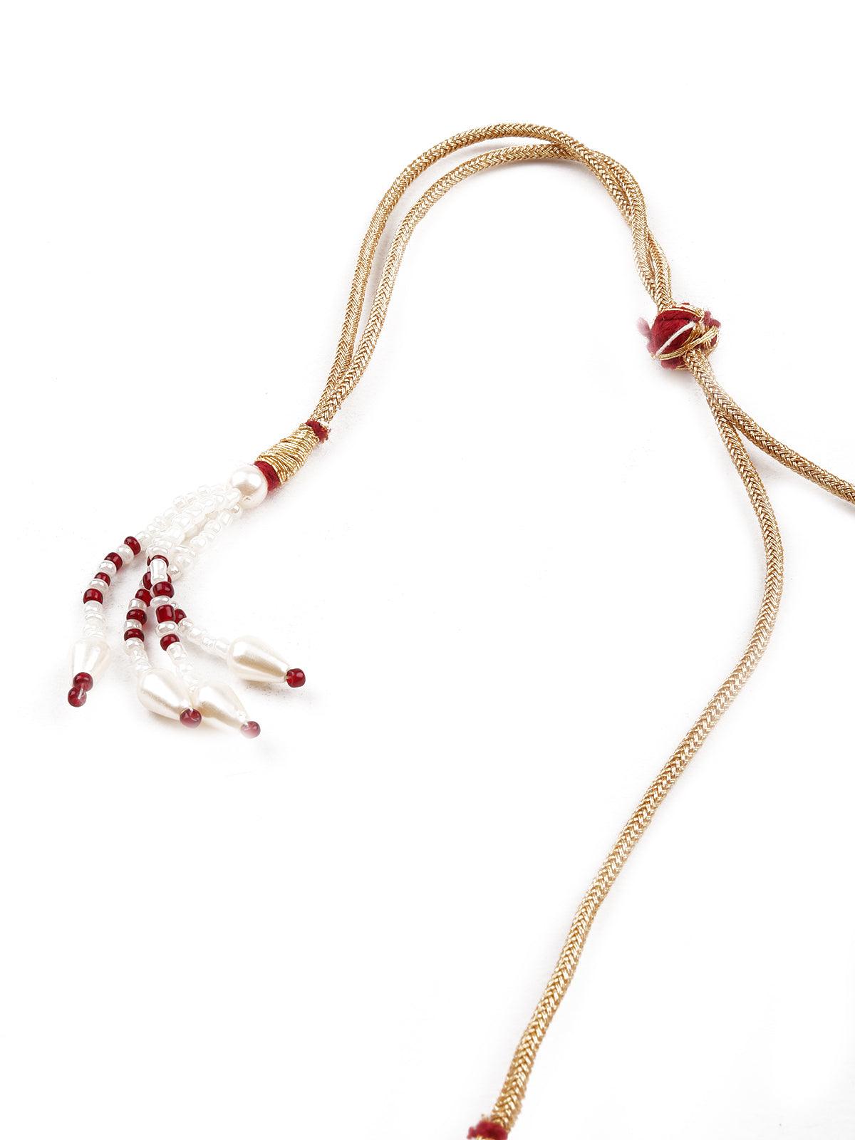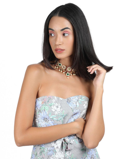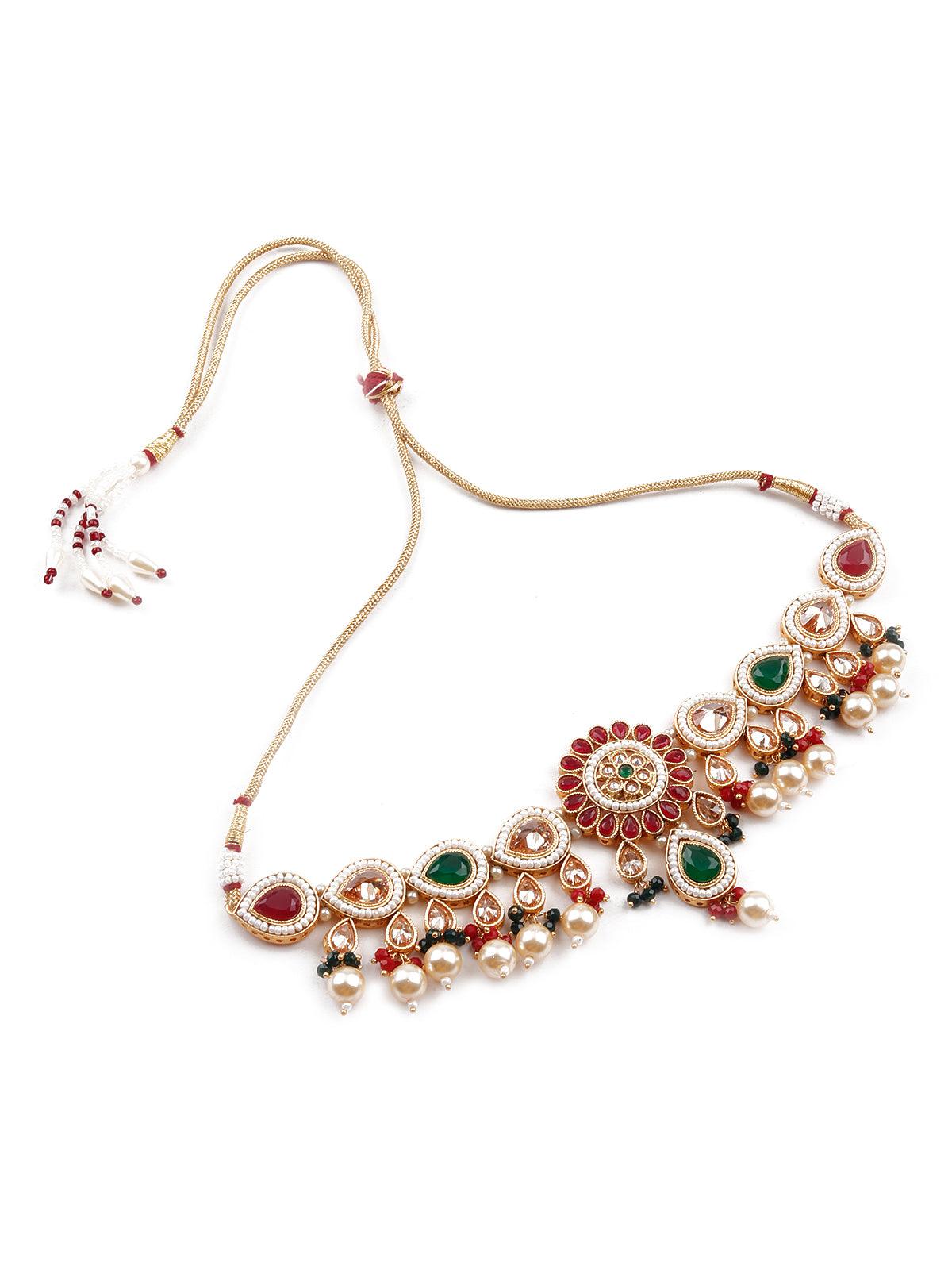 Odette brings you this stunning necklace set that is embellished with green and red artificial stones, the necklace set comes with Kundan work and is sure to accentuate your neckline. The necklace set comes with complimenting earrings! The necklace is secured with a drawstring closure.