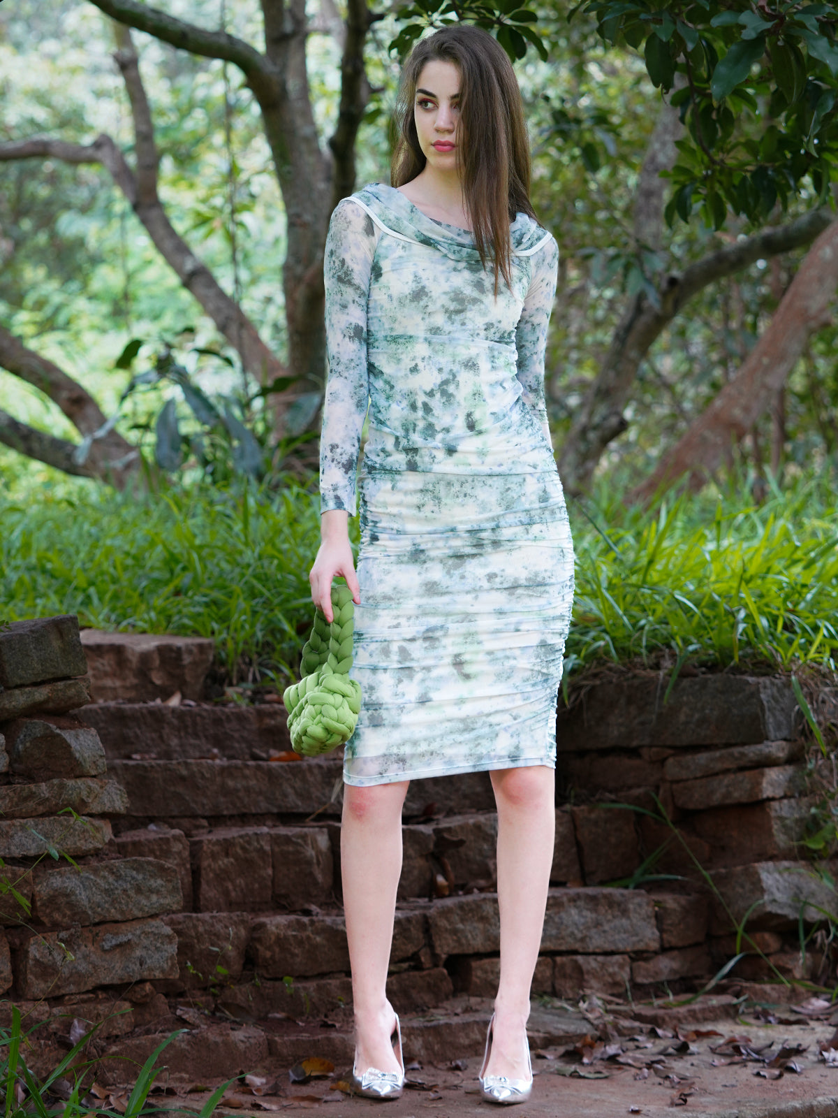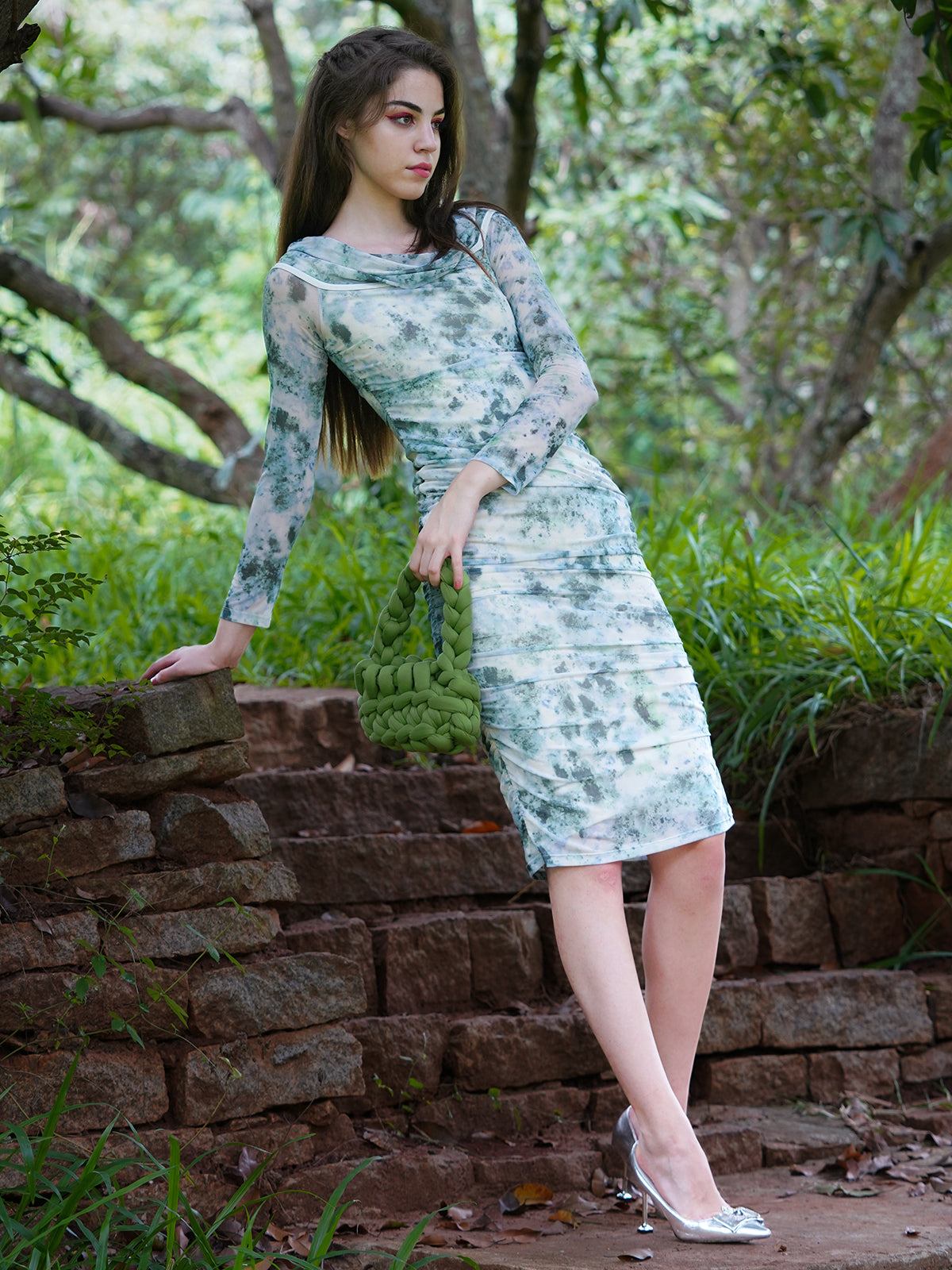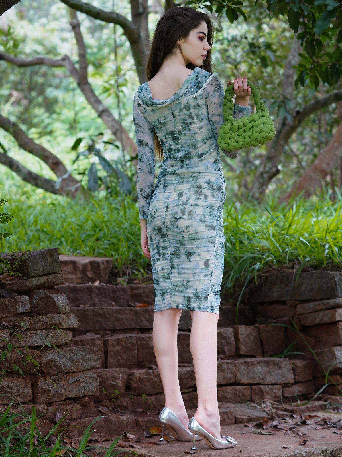 Odette Women White And Green Printed Net Lycra Bodycon Dress
