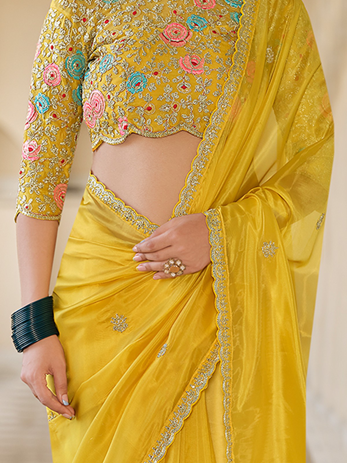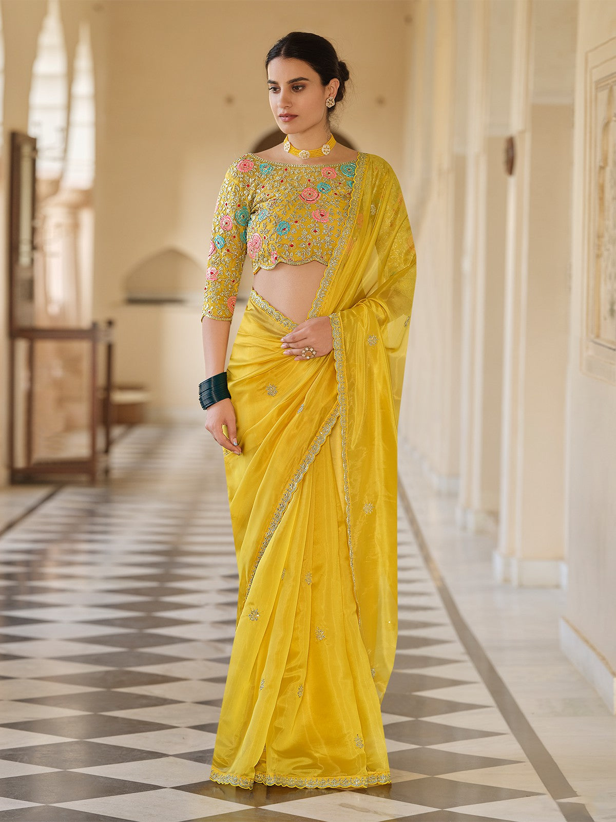 Odette Women Yellow Organza Embroidered Saree With Unstitched Blouse